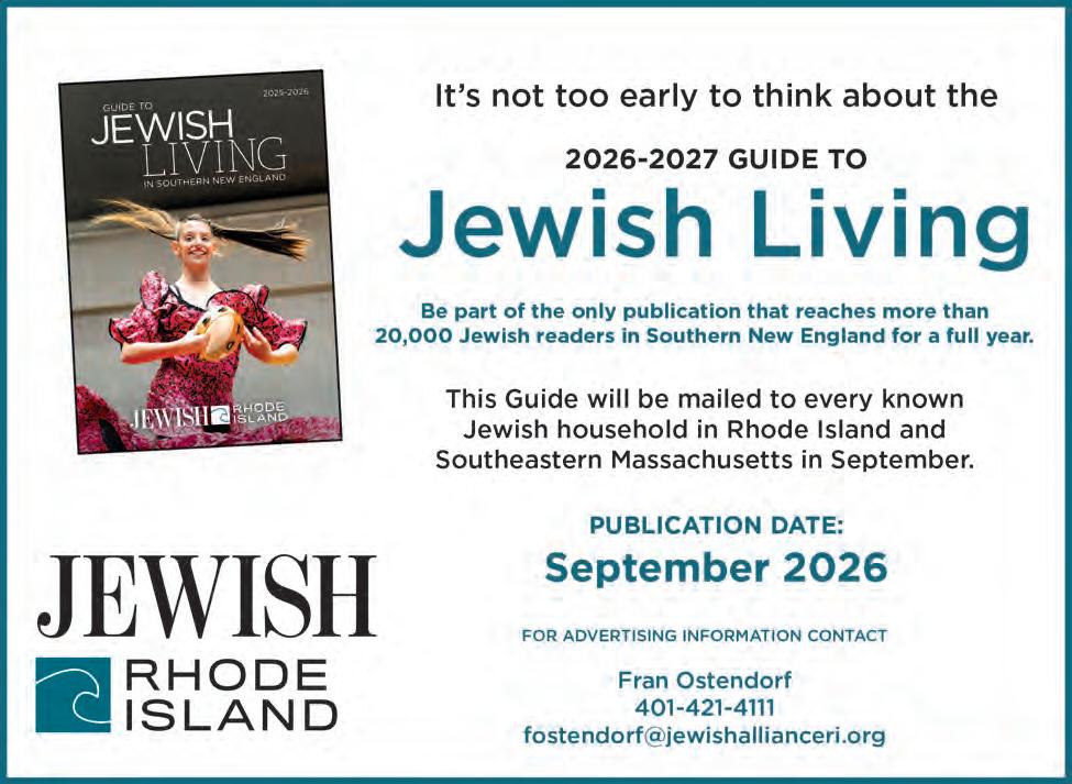 Jewish Rhode Island’s 2025-2026 Guide to Jewish Living is a directory of all things Jewish in the greater Rhode Island community, and a voice for our advertisers and for us. It’s a comprehensive listing of the programs and resources available in our area. And it’s a showcase for the advertisers who support them.