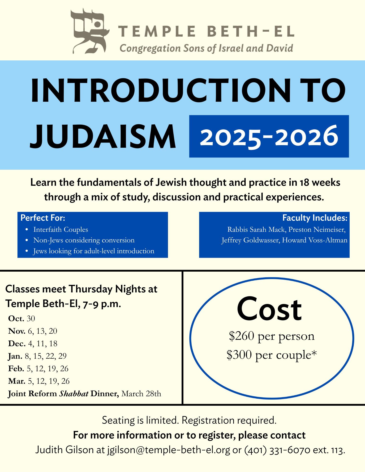 Temple Beth-El Torah Study. Most Saturdays 9 a.m. 70 Orchard Ave., Providence. Join Temple Beth-El clergy and delve into the weekly portion. Information, Jude Weinstein at jweinstein@templebeth-el.org or 401-331-6070.