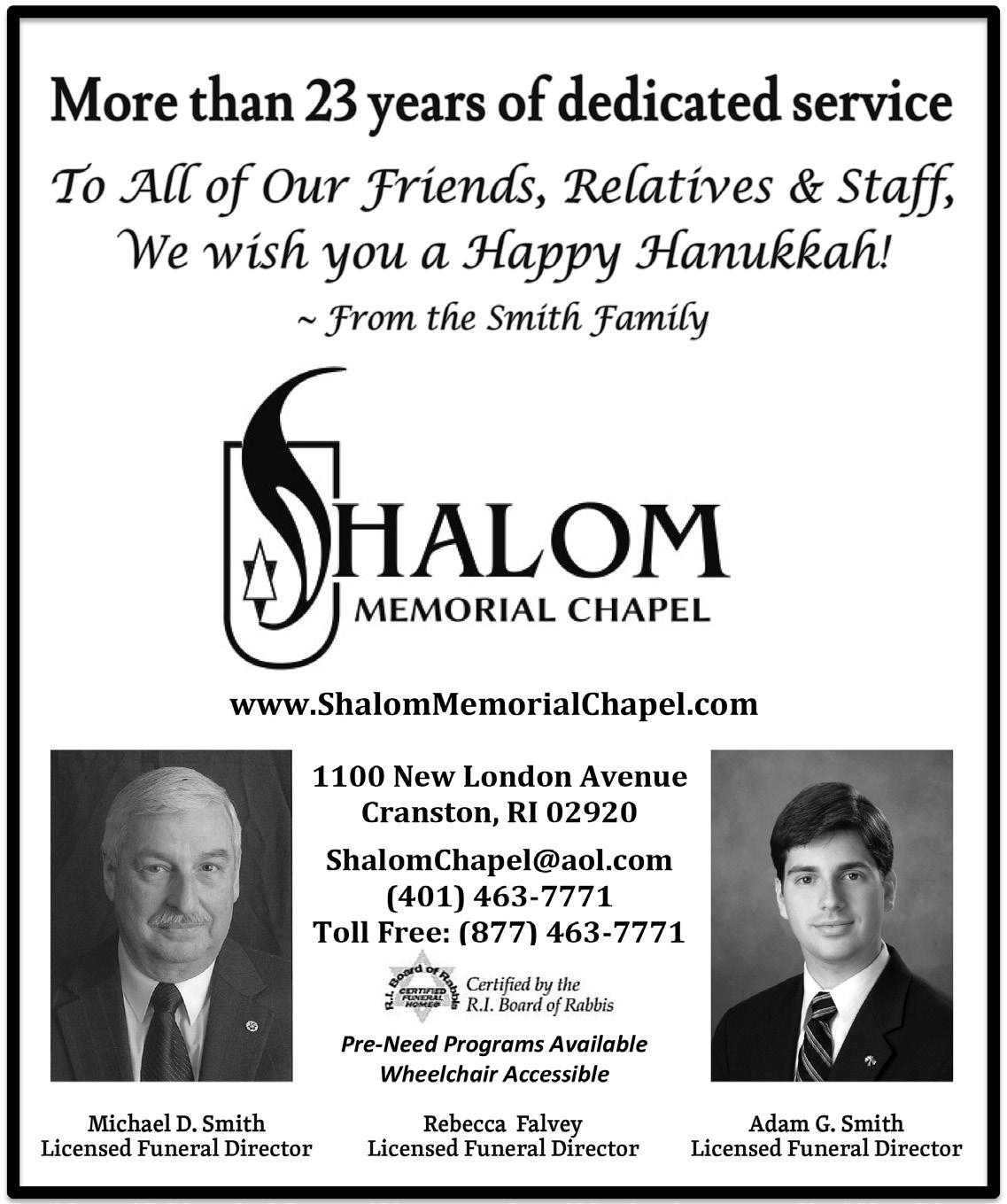 Kosher Senior Café and Pro gramming. In-person lunches 11 a.m.-1 p.m. Monday – Thursday and Friday, 12/16 (Hanukkah Party – see event below), at the Dwares JCC, 401 Elmgrove Ave., Providence; Friday (except 12/16) at Temple Sinai, 30 Hagen Ave., Cran ston. No Café on 12/26. In-person and Zoom programming from 11 a.m.-noon followed by lunch and a guest speaker or discussion from noon-1 p.m. The second Tuesday of the month is “Susie’s Corner” with Susie Adler. The third Thursday of the month is a book chat with Neal Drobnis. Suggested donation: $3 per lunch for age 60 and older as well as for younger adults with a disability. Other adults $6.50. The Kosher Senior Café is a program of Jewish Collaborative Services and is supported by the Jewish Alliance of Greater RI and Blackstone Health. Information and RSVP, Neal Drobnis at neal@jfsri.org or 401421-4111, ext. 107.