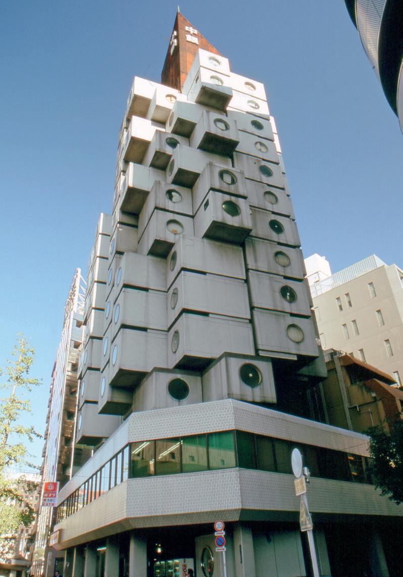 El edificio Nakagin, finalizado en 1972, se ha convertido en uno de los iconos del movimiento metabolista nipón y el más claro ejemplo del empleo de una cápsula prefabricada como célula generadora de un proyecto. Tras la experiencia de Kurokawa en la Expo de Osaka y en concreto con los módulos de la estructura del pabellón Takara Beautilion, un promotor propuso al arquitecto construir en pleno centro de Tokio, en el barrio de Ginza, una torre de apartamentos mínimos, pero con todos los servicios. Su cliente consideraba que muchos pequeños negocios, profesionales o trabajadores de fuera de la capital necesitaban un local de pocos metros cuadrados, que podía ser oficina o vivienda, pero muy bien situado, una condición que satisfacía el solar del que disponía.