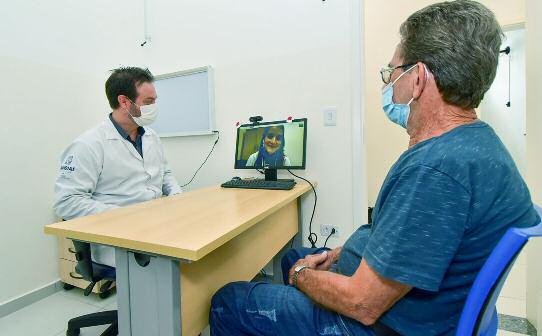 O ser viço está disponível n a s 3 5 U n i d a d e s B á s i c a s d e Saúde (UB Ss), que foram estr uturadas com equipamentos e habilitadas no uso da tecnologia Por meio da platafor ma digital, o médico da UB S conver-