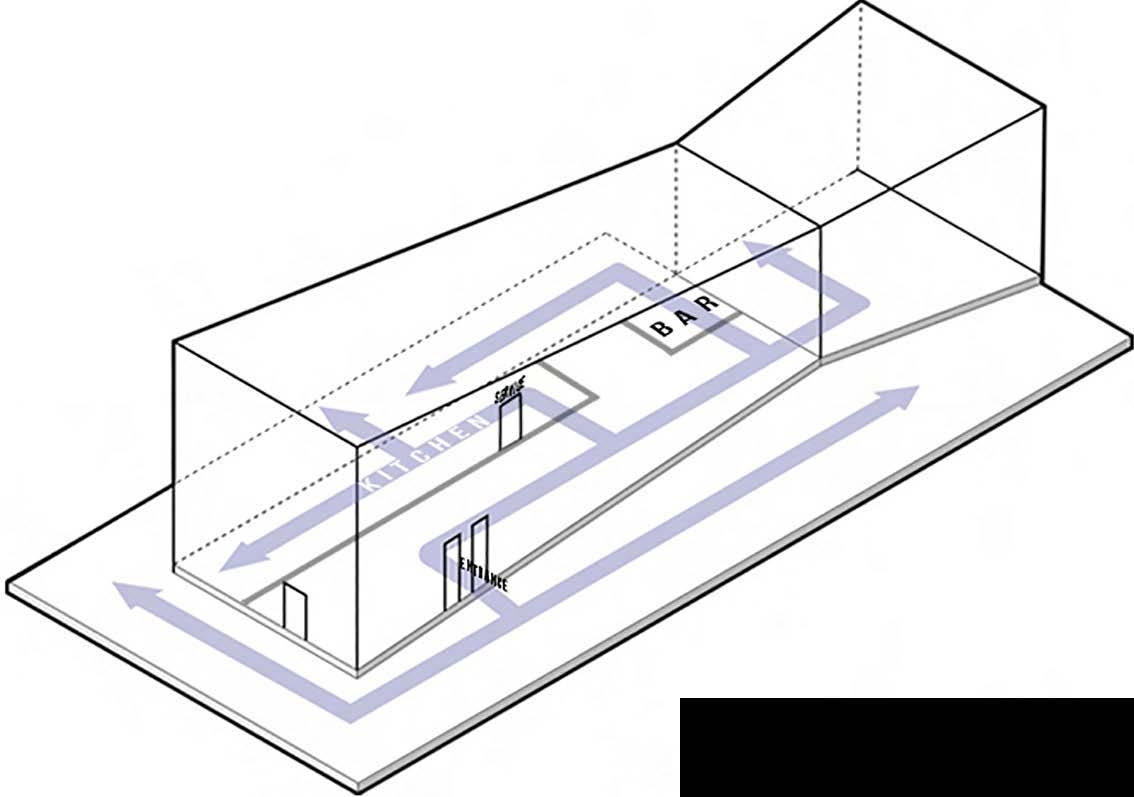 Kitchen service area is pushed towards the back so workers don't disruipt any customers in their movements.