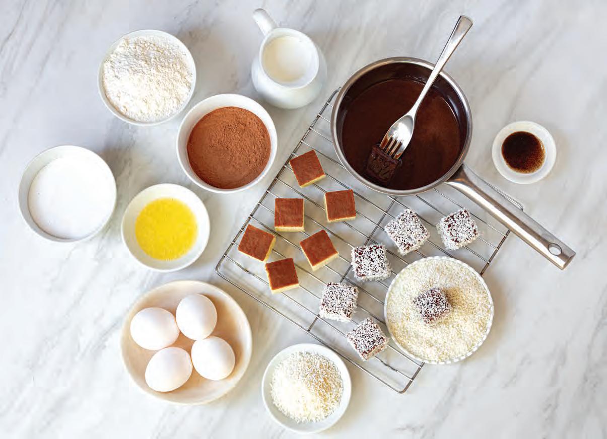 DIP AND COAT CAKE CUBES Sprinkle coconut on a wide plate. Working one cake cube at a time, spear cake cube with a fork and completely immerse it in cooled chocolate sauce. Resting the side of the fork handle on the edge of the sauce pot to allow excess chocolate to drip off. Leaving cube on fork, roll four sides and bottom of coated cake cube in coconut. Sprinkle the top of the cube with more coconut. Slide the finished Lamington onto a wire rack to set up for several hours. Serve with tea or coffee.