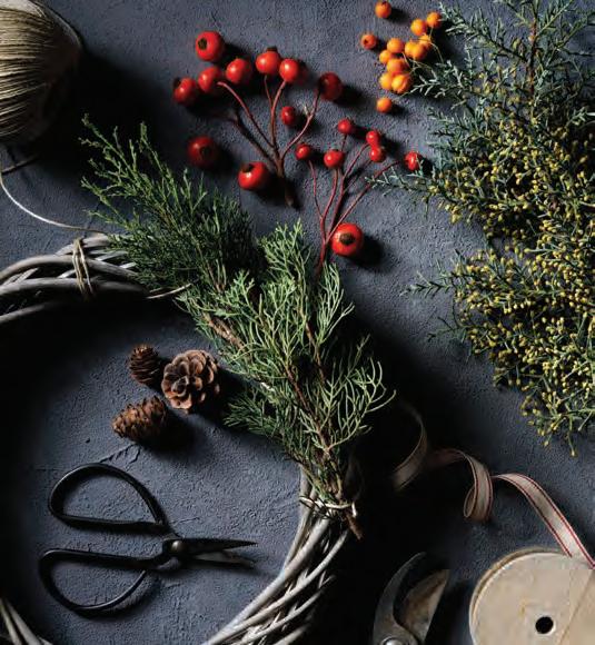 5. FINISH AND HANG Tuck away or trim any stray branches and add a custom bow. Flip your wreath over to attach the remaining ribbon, making a loop of your desired length. Your fresh winter wreath is ready to hang!