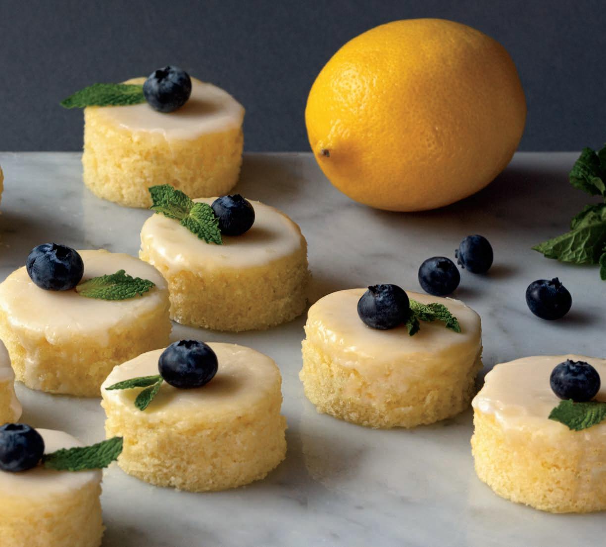 Whisk powdered sugar with lemon juice in a wide shallow bowl until you have a glossy, smooth icing. Dip the top of each cake circle into the glaze, allowing excess to drip back into bowl. Place each little cake right side up on a serving platter. Top with a blueberry and tiny mint leaf. Serve.