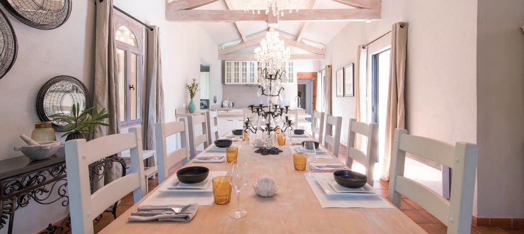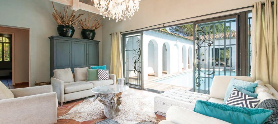 Located near the Gulf of Saint Tropez’s airport, this unique property sits on 2.5 acres. The open living room flows outside to a beautiful patio with a built-in barbeque— perfect for outdoor dining. Indoors, the kitchen opens to