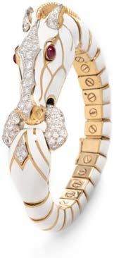 Among an array of jewelry by iconic designers, are the classic designs of revered American jeweler David Webb. Webb is best known for his bold, modern jewelry with yellow gold, colorful gemstones, alluring enamelwork, and exotic animal designs. His creations have been worn by celebrities including Jackie Kennedy, Elizabeth Taylor, and Helen Mirren. David Webb pieces continue to be produced in New York City today using his more than 40,000 original designs and drawings and remain highly sought-after and collectable.
