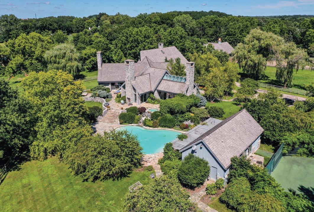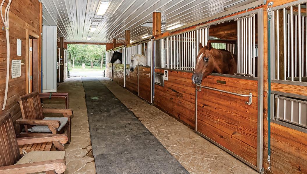 large closets with custom built-in storage. A full walkout basement has an entertaining bar area and wine cellar. The guest house has a kitchen and full bath and sits between the home and the pool, tennis, and bocce courts. A barn with six stalls faces south to protect any animals from the cold north winds.