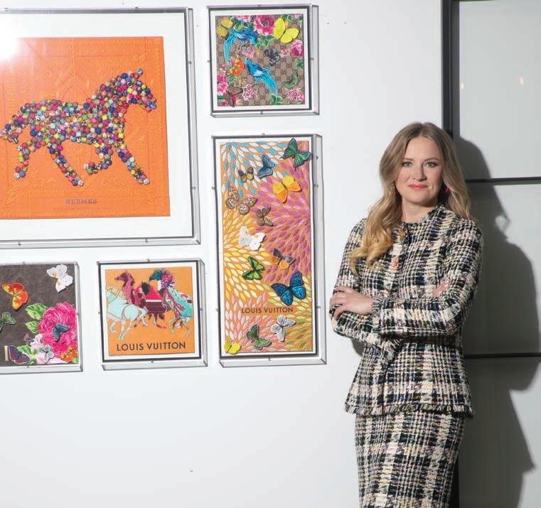 Katie Kuempel, standing in front of Hermés scarves turned art, wearing Oscar de La Renta, neimanmarcus.com