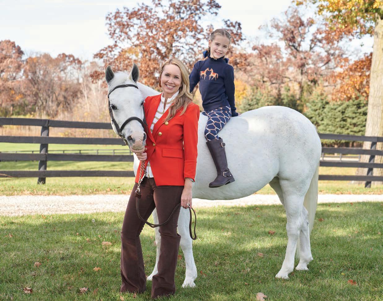 Country vs. Town’s Ashley Garofalo wearing Veronica Beard red wool double breasted blazer with gold bottoms, tan corduroy wide bottom pant neimanmarcus. com, and her daughter, Ella, on her pony, Delta. Photography by Lisa Sciascia, Hair and Makeup by Cathleen Healy, Styling by Theresa DeMaria