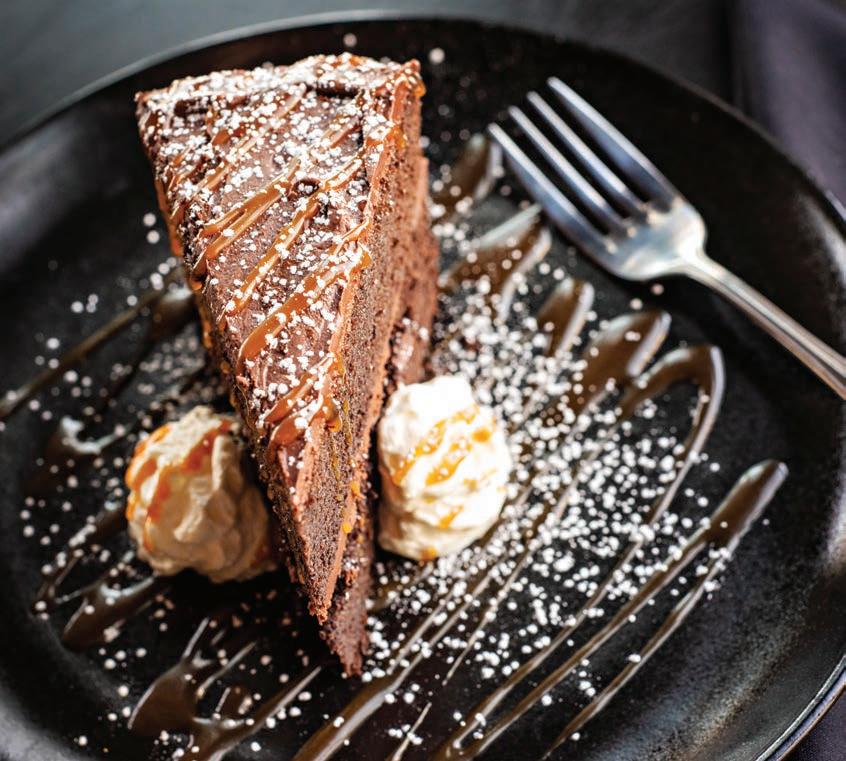 Then there’s Alter’s extraordinary dark-lager chocolate cake, which is one of the best chocolate desserts around. It’s ultra-moist yet undeniably decadent, in part because pastry chef Joscelynn Miller has found a way to incorporate the loamy mocha-flavored head of a well-poured Guinness into its cake batter, before enveloping the cake in a sweet milk-chocolate frosting casing.