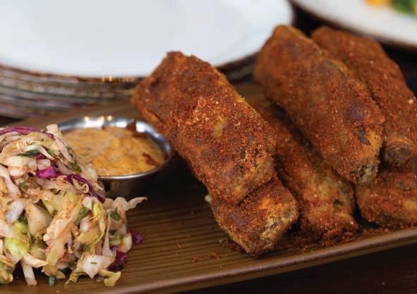 all audiences. Thus Donaldson’s best offerings tend to draw inspiration from country fairs and global street-food stalls. Pretty much everything is meant to be shared, including Donaldson’s signature deep-fried pork ribs. Recognizing that sticky fingers are every gamer’s nightmare, he’s opted to smoke his ribs and then coat them with a sweet-savory dry rub—a Texas-style blend of cayenne, smoked paprika, brown sugar—and then fry them until its baked into a powdery and tasty second skin.