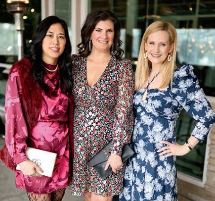 Alicia O’Brien wears a ruffle top by Aje and black skirt by Reiss. Lauren Kavanaugh wears a black and white check jacket by Veronica Beard and pink pants by L’Agance. Stephanie Tuthill wears a black and white dress with ruffle by VALENTINO. All available at Neiman Marcus.