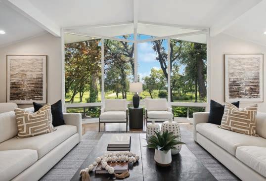 • Elegant living room with cathedral ceilings, hardwood oors, and oor-to-ceiling windows.