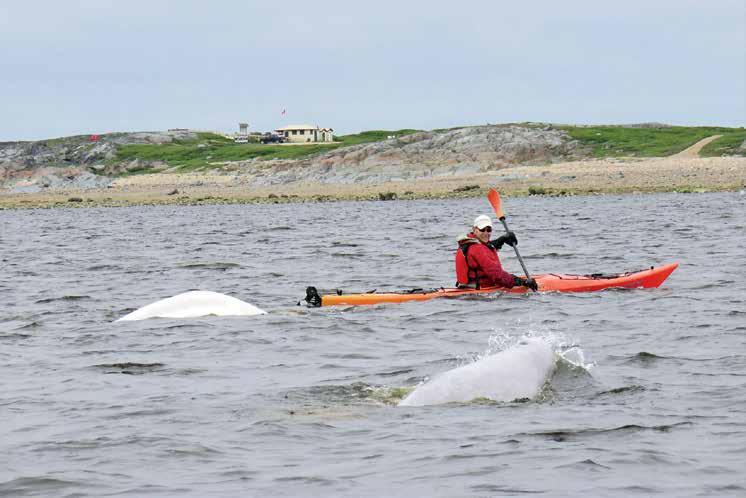 Jim Staples kayaking in Churchill, Manitoba, with beluga whales