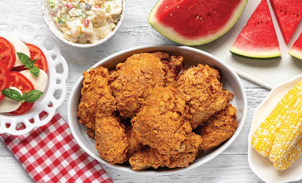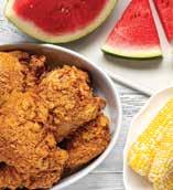July 6 is National Fried Chicken Day, smack in the middle of the Fourth of July holiday weekend. That makes it the perfect time to share our recipe for crunchy on the outside, juicy on the inside, fried chicken. We’ve seasoned it with garlic, onion, and smoked paprika powders, plus a little cayenne for kick. But it’s the overnight soak in buttermilk that really enhances the flavor. For the soak, you’ll season eight pieces of chicken, and then cover them with buttermilk. We used thighs and drumsticks, but any of your favorite bone-in chicken cuts are fine. After the soak, you’ll whisk flour, seasonings and cornstarch together, coat the chicken, let it set up a bit, and deep fry until crispy golden brown in peanut oil.