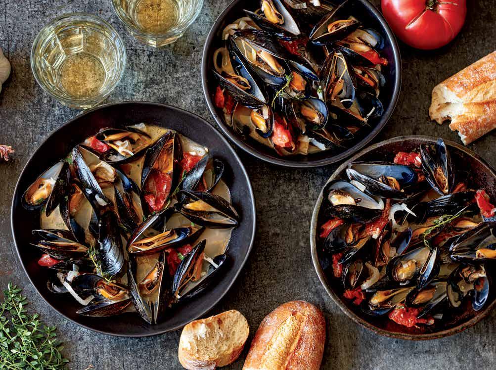 Classic preparations of moules marinières (sailor-style mussels) go back centuries in France and Belgium, requiring nothing more than mussels, shallots, white wine, and butter. Chefs worldwide have tweaked the traditional recipe, adding herbs, sometimes cream, and, in my favorite rendition, garlic, gorgeously ripe tomatoes, and Pernod.
