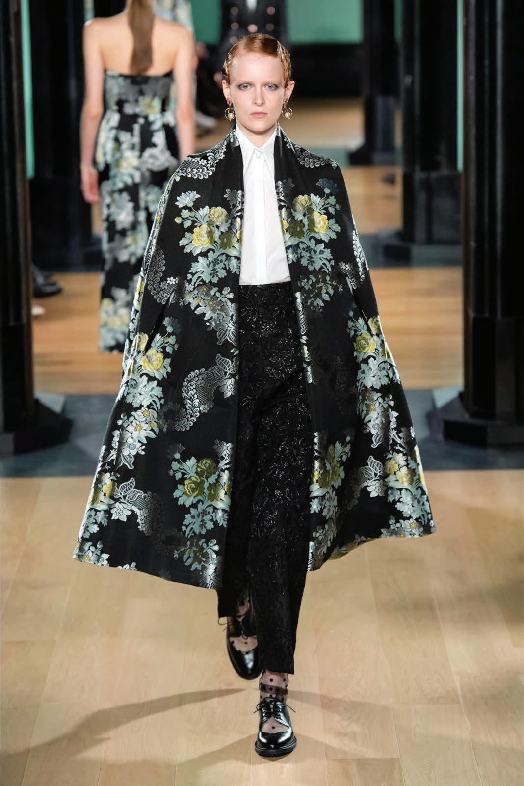 GIANNI VERSACE COUTURE PRINTED SILK VELVET “CANOVA” SKIRT SUIT (1991); BLACK ENAMEL FLORAL RUNWAY EARCLIPS (1991); BLACK BEAD AND FLORAL BRACELET (1991); ALL BY GIANNI VERSACE