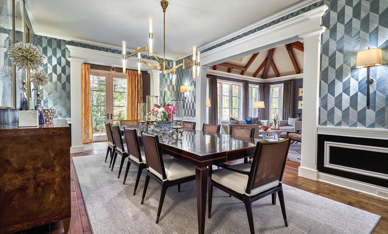 Trends on the horizon? We’re seeing a move away from the modern farmhouse look and back to more traditional styles with the use of color and wallpaper.