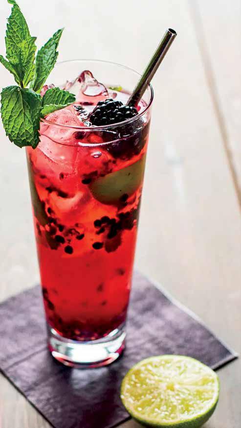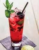 In the bottom of a mixing glass, muddle berries and one sprig of mint with simple syrup. Add spirits and lime juice. Shake vigorously with ice to chill. Using a fine mesh strainer, strain onto fresh ice in a Collins or highball glass. Top with sparkling water and stir. Garnish with berries and the remaining sprig of mint.