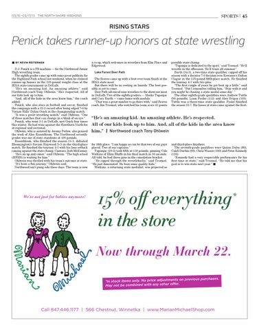 Penick takes runner-up honors at state wrestling ■ by kevin reiterman D.J. Penick is a PR machine — for the Northwood Junior High wrestling team. The eighth-grader came up with some great publicity for the Highland Park school last weekend, when he claimed runner-up honors in the 135-pound weight class at the IESA state tournament in DeKalb. “He’s an amazing kid. An amazing athlete,” said Northwood coach Tony Ohlwein. “He’s respected. All of our kids look up to him. “And, all of the kids in the area know him,” the coach added. Penick, who also stars in football and soccer, finished the campaign with a 32-2 record after being edged 7-6 by Vernon Hills’ Dylan Geick in the championship match. “It was a great wrestling match,” said Ohlwein. “One of those matches that can change in a blink of an eye.” Penick, who went 3-1 in DeKalb, met Geick four times this winter. He had wins against the Hawthorn North foe at regional and sectional. Ohlwein, who is assisted by Jeremy Perlow, also praised the work of Alex Rosenbloom. The Northwood seventhgrader was one of state standouts at 105 pounds. Rosenbloom, who finished the season 31-3, defeated Bloomington’s Savion Haywood 5-3 in the third-place match. He finished the tourney 4-1 with his lone setback coming against the state champ: Canton’s Josh McKinney. “He’s an up and comer,” said Ohlwein. “The high school (HPHS) is waiting for him.” Ohlwein was thrilled with his team’s outcome at state. “It’s been a fun journey,” Ohlwein said. Northwood isn’t going solo these days. The team is now