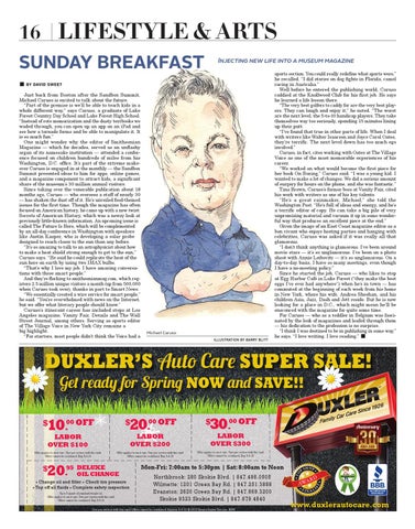 sports section. You could really redefine what sports were,” he recalled. “I did stories on dog fights in Florida, camel racing in Australia.” Well before he entered the publishing world, Caruso caddied at the Knollwood Club for his first job. He says he learned a life lesson there. “The very best golfers to caddy for are the very best players. They can laugh and enjoy it,” he noted. “The worst are the next level, the 5-to-10 handicap players. They take themselves way too seriously, spending 15 minutes lining up their putt. “I’ve found that true in other parts of life. When I deal with writers like Walter Isaacson and Joyce Carol Oates, they’re terrific. The next level down has too much ego involved.” Caruso, in fact, cites working with Oates at The Village Voice as one of the most memorable experiences of his career. “We worked on what would become the first piece for her book On Boxing,” Caruso said. “I was a young kid. I wanted to make a lot of changes. We did a serious amount of surgery for hours on the phone, and she was fantastic.” Tina Brown, Caruso’s former boss at Vanity Fair, cited his work with writers as one of his key talents. “He’s a great rainmaker, Michael,” she told the Washington Post. “He’s full of ideas and energy, and he’s a terrific editor of copy. He can take a big pile of very unpromising material and vacuum it up in some wonderful way that produces an excellent piece at the end.” Given the image of an East Coast magazine editor as a bon vivant who enjoys hosting parties and hanging with celebrities, Caruso was asked if it was really all that glamorous. “I don’t think anything is glamorous. I’ve been around movie stars — it’s so unglamorous. I’ve been on a photo shoot with Annie Leibovitz — it’s so unglamorous. On a day-to-day basis, I have so many meetings, even though I have a no-meeting policy.” Since he started the job, Caruso — who likes to stop at Egg Harbor Café in Lake Forest (“they make the best eggs I’ve ever had anywhere”) when he’s in town — has commuted at the beginning of each week from his home in New York, where his wife, Andrea Sheehan, and his children Asia, Jazz, Dash and Jett reside. But he is now looking for a place in D.C., which might mean he’ll be ensconced with the magazine for quite some time. For Caruso — who as a toddler in Belgium was fascinated by the look of magazines and leafed through them — his dedication to the profession is no surprise. “I think I was destined to be in publishing in some way,” he says. “I love writing. I love reading.” ■