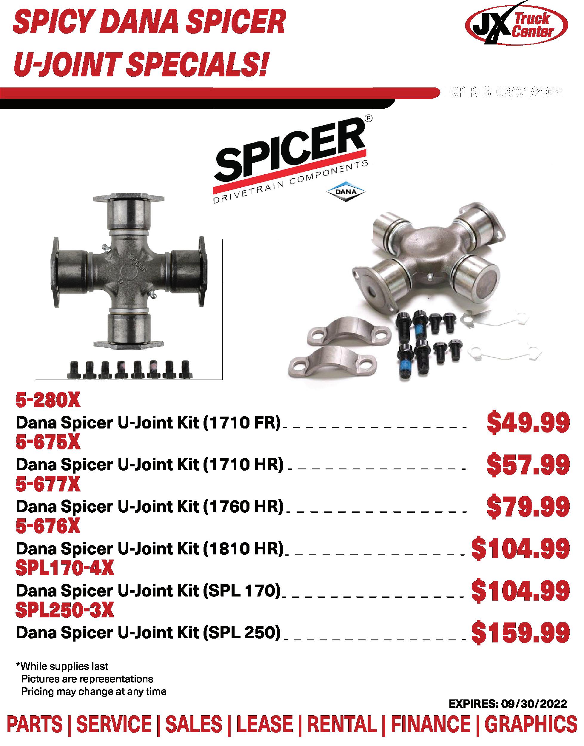 PARTS | SERVICE | BODY SHOP | SALES | FINANCE | LEASE | RENTAL | GRAPHICS jxe.com 2/1/2024 - 3/31/2024 *While supplies last. Pictures are representations. Pricing may change at any time DANA SPICER U-JOINTS & CENTER BEARING SPECIALS! $5 off with Paccar coupon code: M24FEB5964 Part Number Description Promo Price Additional Coupon Savings Available Valid 2/1/24 - 2/29/24 Center Support Bearing-Driveline KIT-U Joint KIT-U Joint, 1710 FR KIT-U Joint, 1710 HR KIT-U Joint, 1810 HRL KIT-U Joint, 1760 HR KIT-U Joint SPL250 KIT-U Joint SPL100 5-103X 5-280X 5-675X 5-676X 5-677X SPL100-1X SPL250-3X 10094142 $22.99 $56.99 $59.99 $104.99 $74.99 $109.99 $159.99 $89.99
