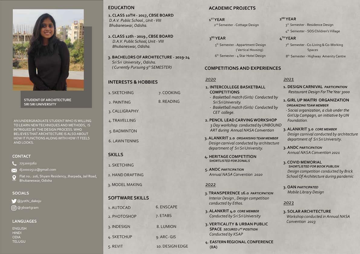 D. JYOTHIRMAI 4 VV VV VV VV VERTICAL NEIBOURHOOD 5TH Semester Pg: 6 - 9 CONTENTS... 1. 2. 3. 4. 4- STAR HOTEL 6TH Semester Pg: 10 - 13 HIGHWAY AMENITY CENTRE 8TH Semester Pg: 18 - 21 CO-LIVING & CO-WORKING SPACE 7TH Semester Pg: 14 - 17