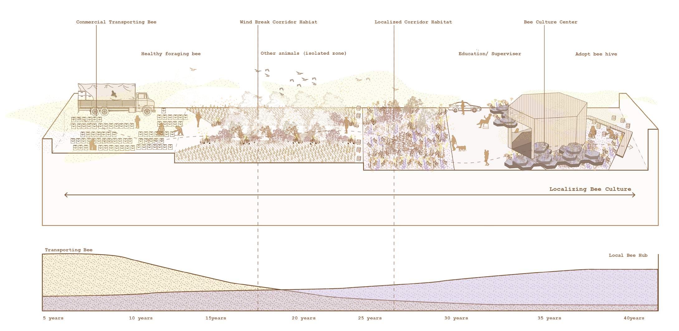 Landscape architects have discussed the wild creature refugees and reexamined the wildlife habitat more and more. By doing this thesis research on the commercial bees, I understand that how significantly the pollinators such as bees and other wild species played a role in the landscape and the whole ecosystem, which face issues such as increasing anthropogenic pressure, including over-cultivated land, modern agriculture systems, mono-crop deserts, and the overuse of pesticides. Future landscapers face severe problems of loss of natural habitats. As a young designer, my destination is to create a resilient landscape design that balances and increases biodiversity while educating others to protect nature.
