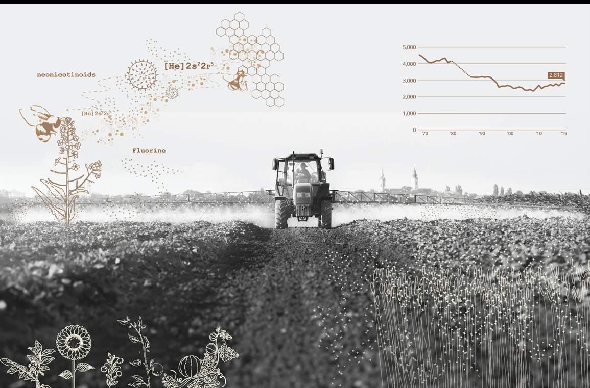 cultivated land, modern agriculture systems, monocrop deserts, and the overuse of pesticides. All these activities are causing bees, especially honeybees to suffer from pesticides polluting, poor nutrition supply, and parasite attacks. Yearly, 35% - 55% of the bee colonies have become extinct. 1