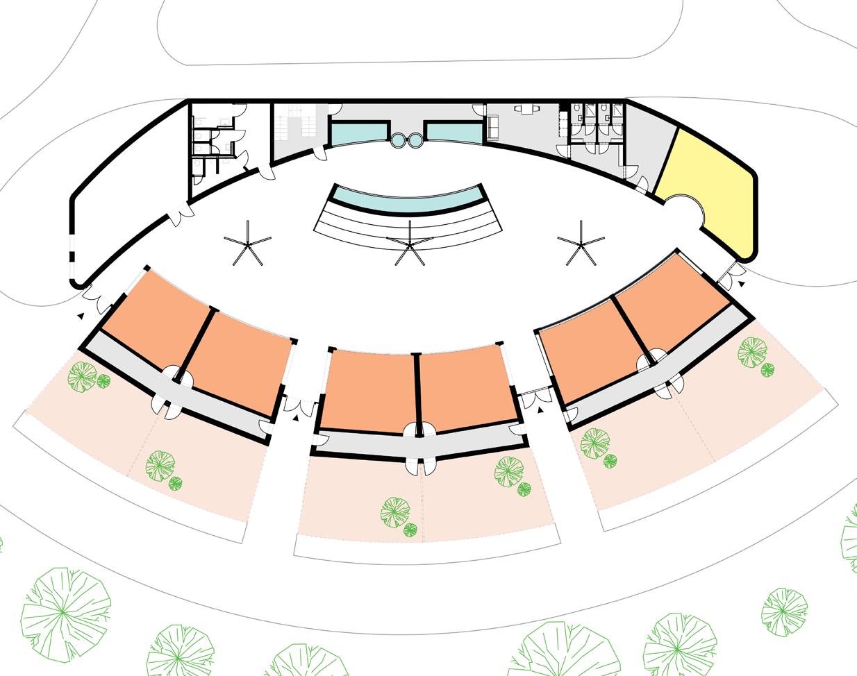 Celá idea návrhu vychází z hledání organického tvaru, který by do ZOO zapadal. Vzhledem k pozemku a požadavku na jednoduchost jsem zvolila tvar elipsy, kterou jsem rozdělila na dvě poloviny a jednu zvětšila a protáhla. Vznikl tak velký centrální prostor pro návštěvníky a kolem něj dva půlměsíce, ve kterých jsou umístěny výběhy zvířat, akvária a prostor pro zaměstnance.