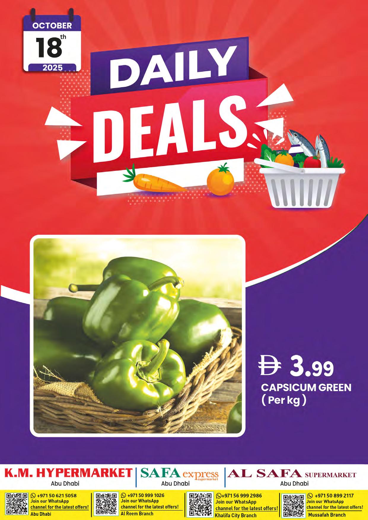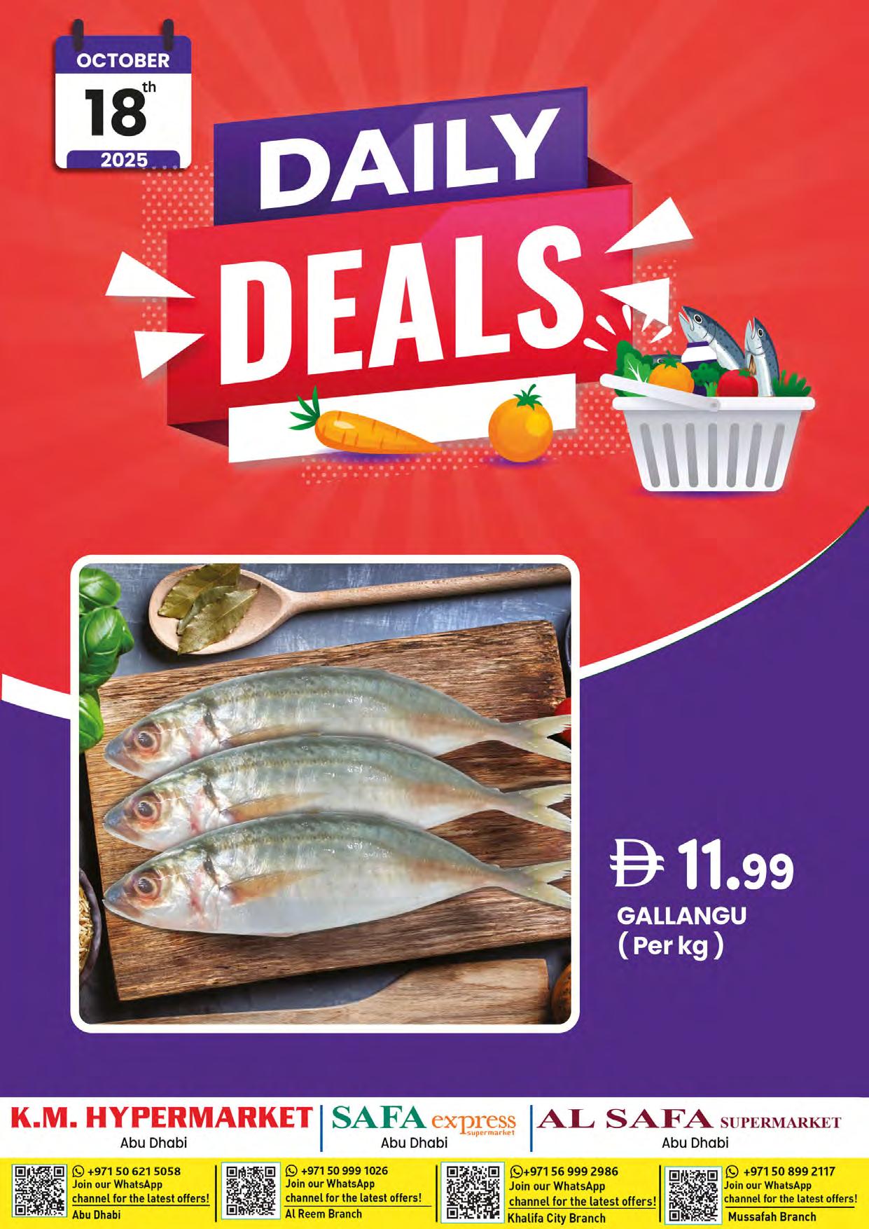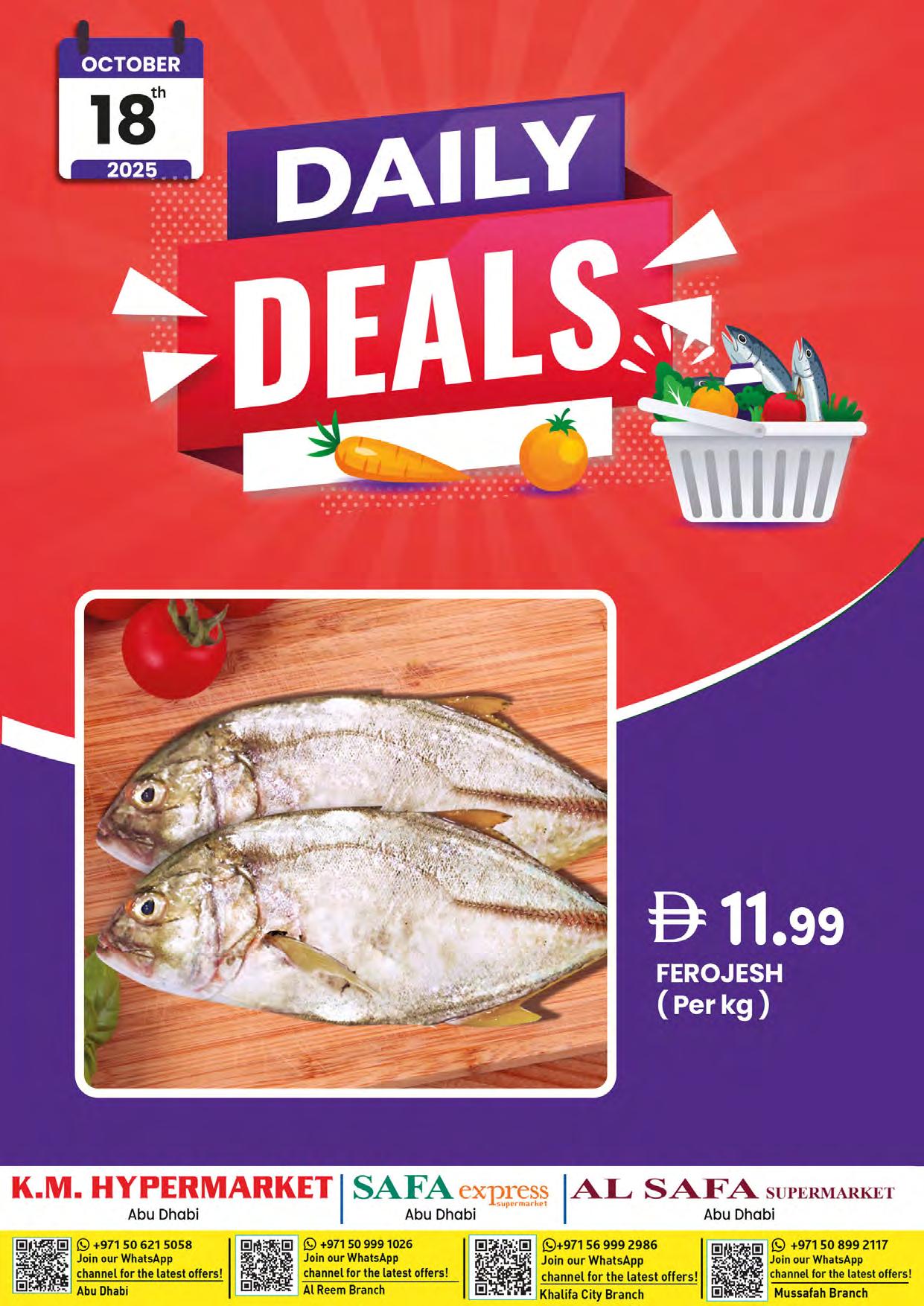 Enjoy unbeatable freshness and savings with our Daily Deals on Fresh Fish, Fruits & Veggies – available 18th October 2025 at K.M. Hypermarket, Safa Express & Al Safa branches in Musaffah, TCA, and Najda, Abu Dhabi.