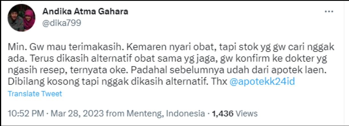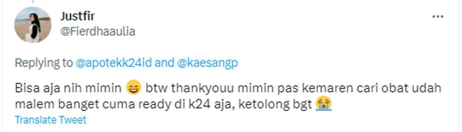 Terima kasih untuk Sobat Sehat yang sudah mempercayakan kebutuhan kesehatannya di Apotek K-24. Apotek K-24 selalu berkomitmen untuk melayani pelanggan dengan sepenuh hati.