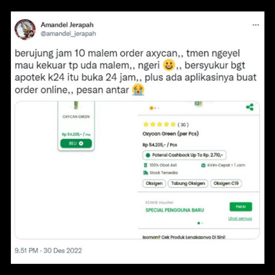 Selain layanan offline atau langsung, Apotek K-24 juga memudahkan masyarakat dengan adanya layanan secara online. Layanan ini bisa Anda dapatkan melalui aplikasi K24Klik atau www.k24klik.com. Artinya, Anda dapat memesan obat secara online yang