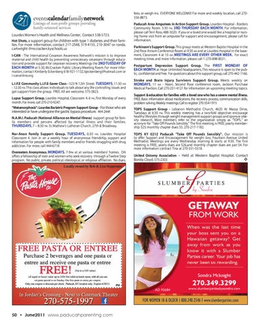 Lourdes Women's Health and Wellness Center, Contact 538-5723. Hot Shots, a support group for children with type 1 diabetes and their families. For more information, contact 217-2548, 519-4155, 210-3047 or ronda. cartwright @mccracken.kyschools.us I-CAN - The International Cesarean Awareness Network's mission is to improve maternal and child health by preventing unnecessary cesareans through education and provide support for cesarean recovery. Meetings the 2ND TUESDAY OF EACH MONTH at 5:30, McCracken Public Library Meeting Room. For more information, contact Kimberly Eckenberg 618-921-1132, kjeckenberg@hotmail.com or i-canonline.org L.I.F.E Community L.I.F.E-Saver Class - 523 N 12th Street. TUESDAYS, 11:30 AM - 12:30 PM.This class allows individuals to talk about any life-controlling issues and get support from the group. FREE. All are welcome. 575-3823. Lupus Support Group. Lourdes Hospital, Classroom 4. 6 PM, first Monday of every month. For more, call 270-210-9247. “Metamorphosis�: Lourdes Bariatric Program Support Group - For those who are interested or have undergone the gastric bypass procedure. 444-2444 N.A.M.I. Paducah (National Alliance on Mental Illness) support group for family members and persons affected by mental illness and their families. THURSDAYS, 7 – 8:30 PM. St. Mathew’s Lutheran Church, 27th & Broadway.