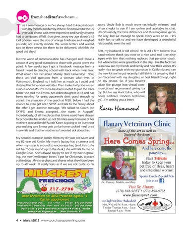 apart. Uncle Bob is much more technically oriented and often checks to see if I am online and available to chat. Unfortunately, the time difference and this magazine get in the way, but we manage to speak every week or so. He’s really fun to talk to and we have developed a wonderful relationship over the net! Britt, my husband, is ‘old school’. He is still a firm believer in a hand written thank you note or a nice card and I certainly agree with him that nothing replaces that personal touch. But while letters were great back in the day, I like the fact that I can now see my friends and family and hear their voices. It’s really nice to speak with my grandson in California and see the new kitten he got recently. I still think it’s amazing that I can ‘Facetime’ with my daughter, or best friend Cheryl, right on my phone. So, if you haven’t taken the plunge into virtual communication I recommend giving it a try. But for my Aunt Edna, who will never embrace ‘modern technology’…I’m writing you a letter.