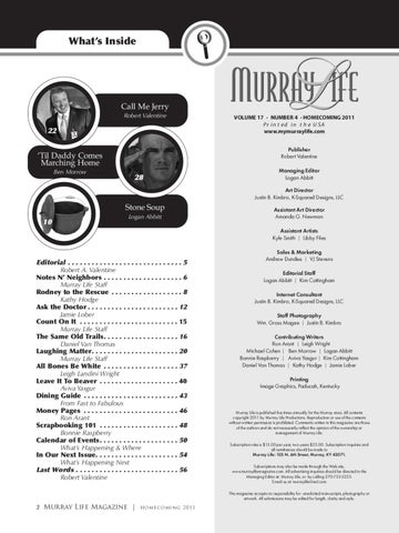Murray Life is published five times annually for the Murray area. All contents copyright 2011 by Murray Life Productions. Reproduction or use of the contents without written permission is prohibited. Comments written in this magazine are those of the authors and do not necessarily reflect the opinion of the ownership or management of Murray Life. Subscription rate is $15.00 per year, two years $25.00. Subscription inquiries and all remittances should be made to Murray Life: 105 N. 6th Street, Murray, KY 42071. Subscriptions may also be made through the Web site, www.murraylifemagazine.com. All advertising inquiries should be directed to the Managing Editor at: Murray Life, or by calling 270-753-5225. E-mail us at: murraylife@aol.com This magazine accepts no responsibility for unsolicited manuscripts, photography or artwork. All submissions may be edited for length, clarity and style.