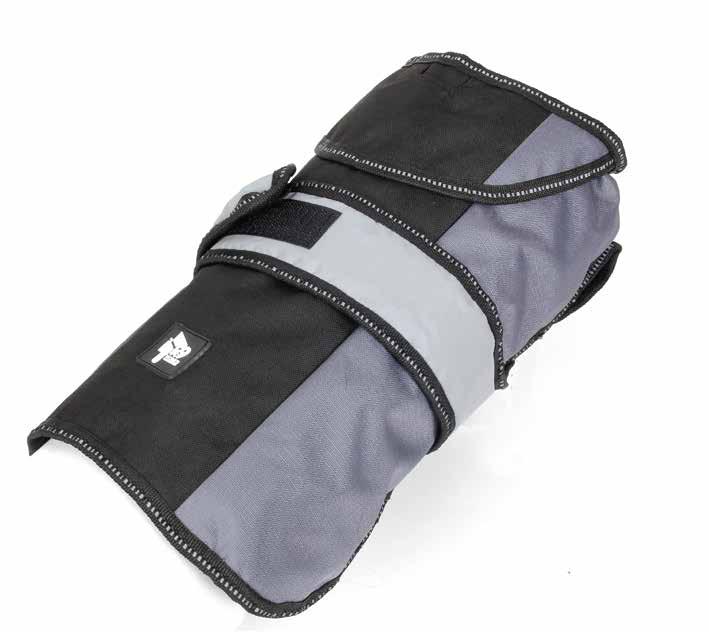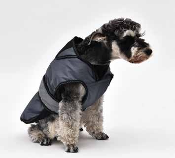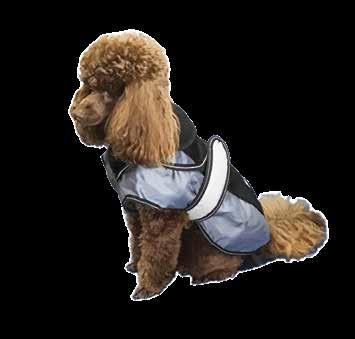Reflective Beading around the coat for night safety protection and a buttonhole on the back of the coat for a collar or harness attachment.