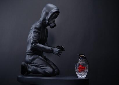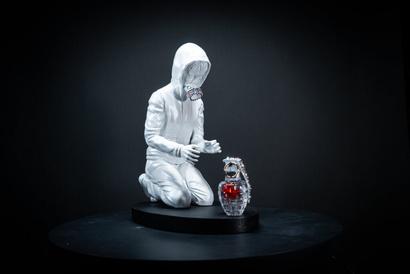 The piece depicts a young boy wearing a gas mask and poised to pull the pin on a clear resin grenade. Inside, a floating heart symbolizes the vaccine and hope guiding us through uncertain times. Limited to an edition of 50, each sculpture contains an exclusive four-track EP by Maxim, making it a unique fusion of visual and audio art. This collaboration merges Pearce's expertise in 3D modeling with Maxim's signature use of grenade imagery and resinsuspended objects.
