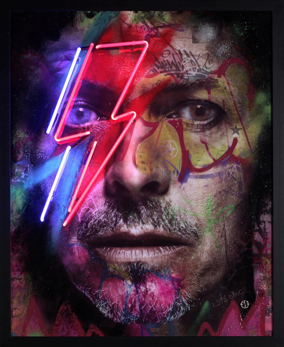 He set about mixing modern day influences of Dface, Shepard Fairey with his older art college influences of Warhol and Lichtenstein to carve out his own style, a unique explosion of energy and colour.