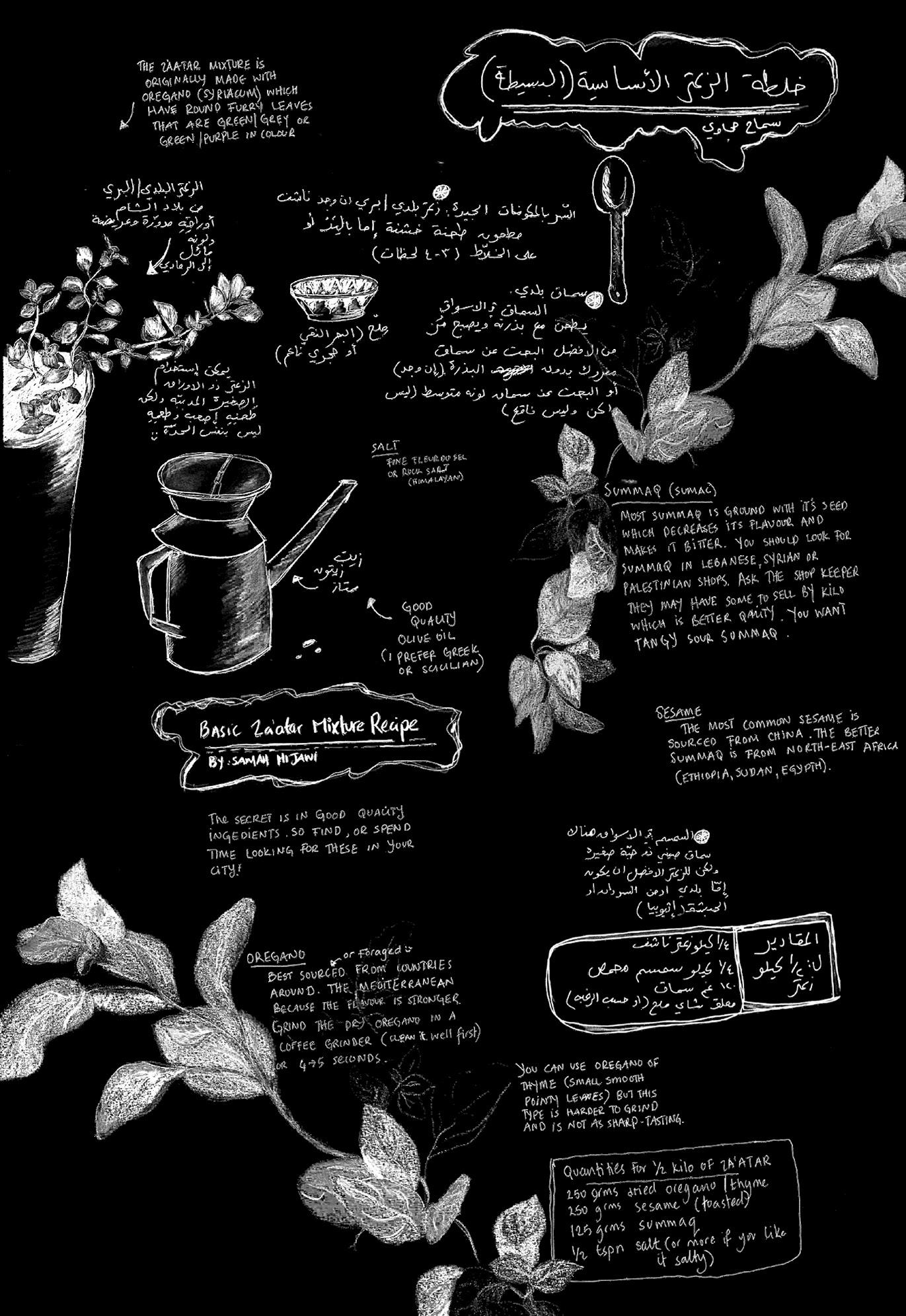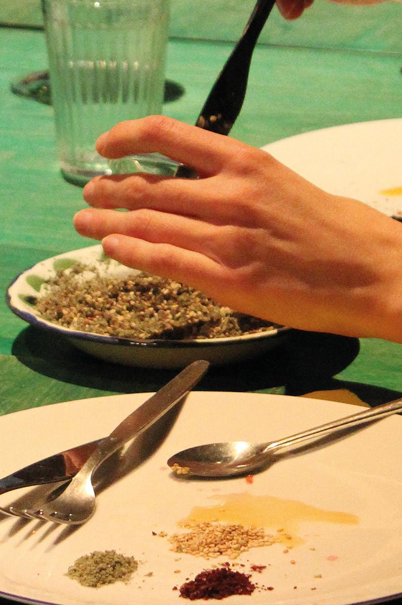 Kitchen. Table. was guided by the three plants that make the herbal mixture za’tar. This food which carries the same name of the plant za’tar ‘oregano’ in Latin and English is a staple in the Arab Eastern Mediterranean kitchen. It is an everyday food consumed by dipping bread into olive oil, and then into the za’tar mixture, and eating it. Or it is sprinkled on a small freshly-baked pizza called Man’oushe Za’tar.