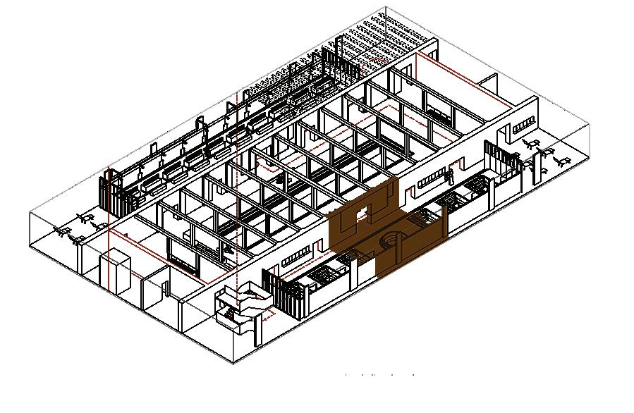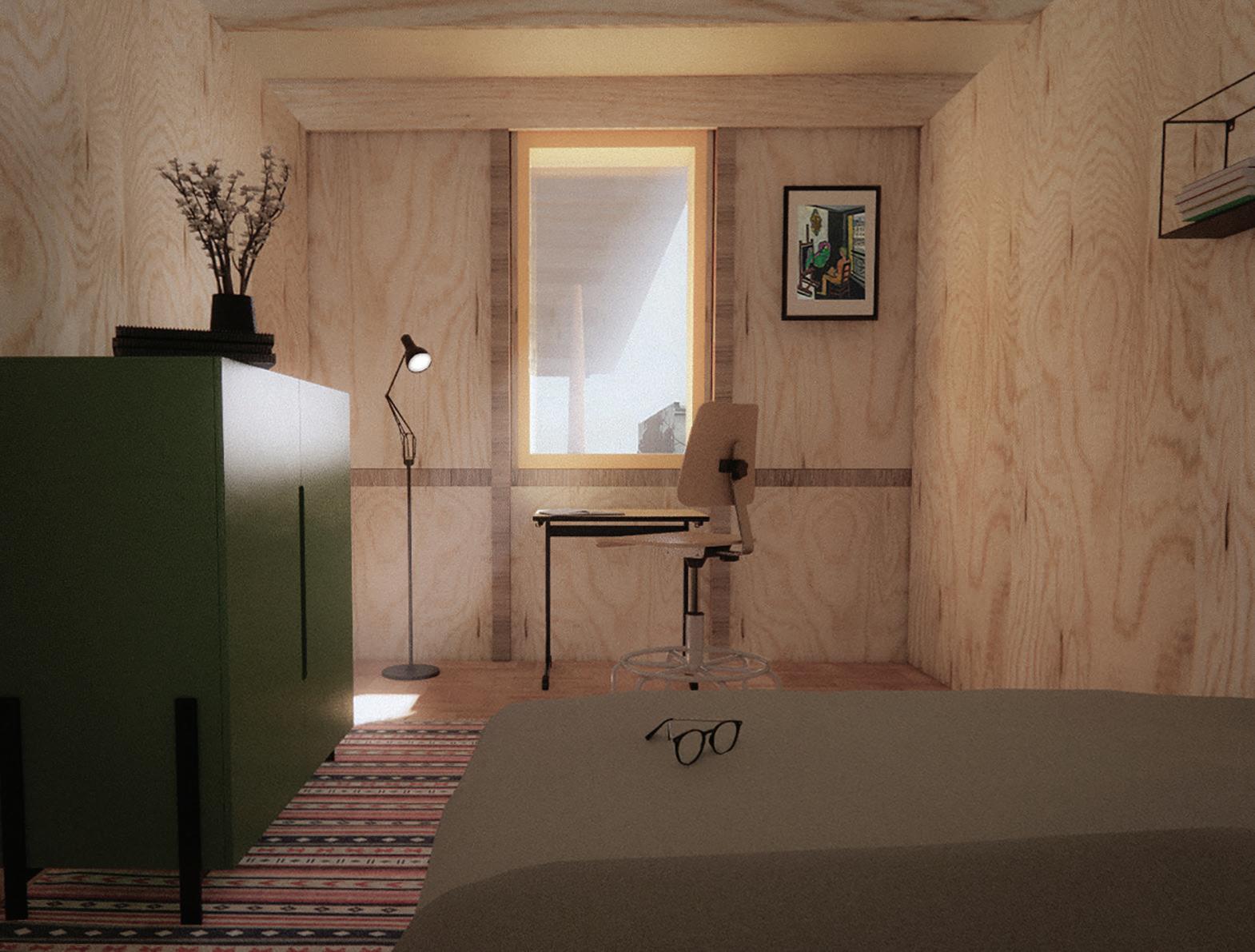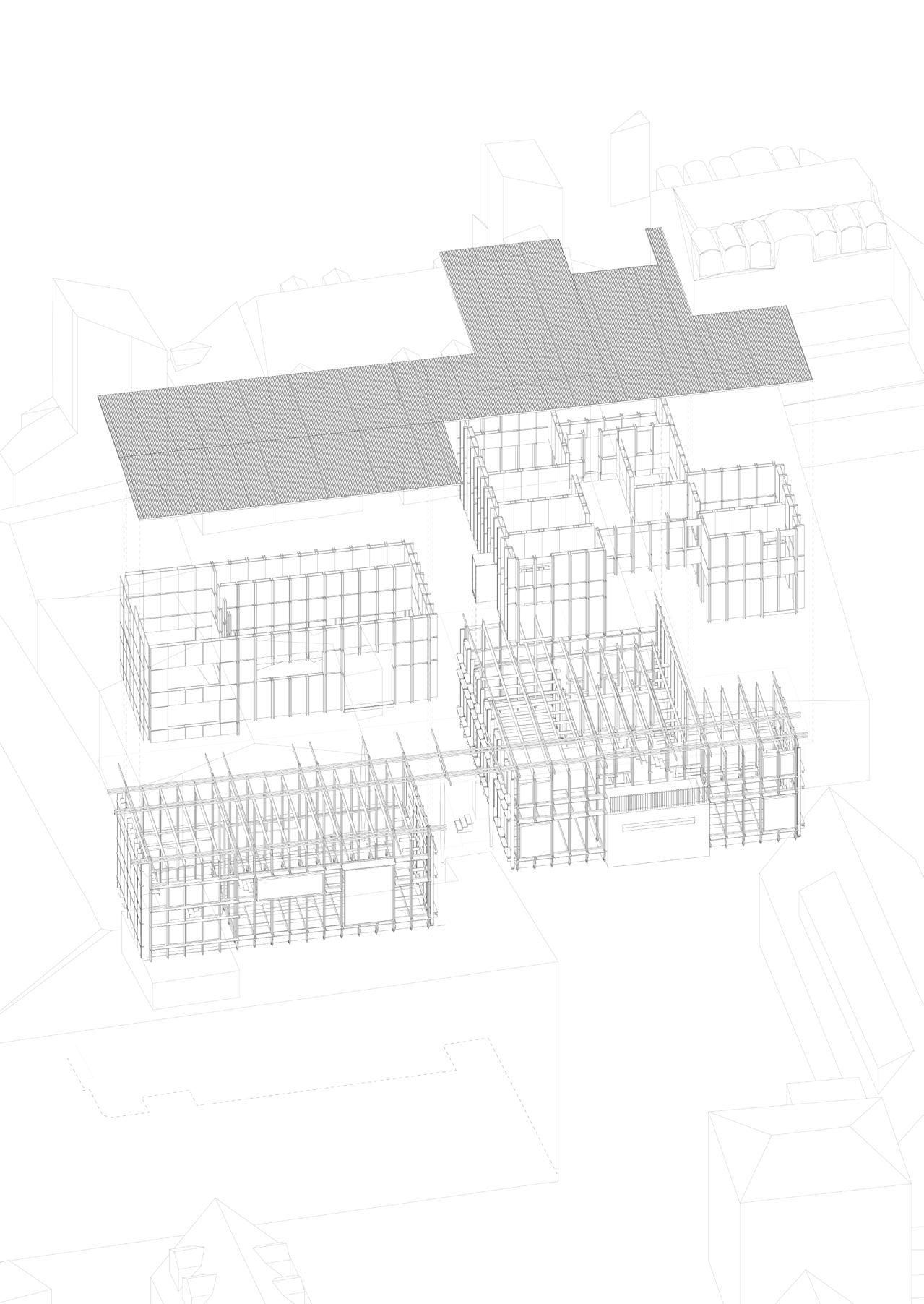 I tried to create two buildings gathered under one roof in order to create a gate: one building for housing and the other for a framing workshop. The building is lifted from the ground and in its wooden character has a furniture-like feeling which compliments the surroundings of the medieval atrium, creating a new courtyard.