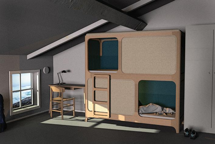 Mit endelige designforslag, Moulin, er en køjeseng med afrundede, rolige former i matlakeret bøg med akustiske paneler i formfleece. Formfleecen udenpå har en varm sandfarve, der skal være med til at gøre værelset, hvor den står, større og give lys i de mørke måneder. Sengen er tænkt som et system. Den er nem at transportere, nem at samle, men også ekstremt stabil. Formfleece plader på hver etage hjælper med statikken ved at blive monteret hele vejen rundt på både ben, sarg og sprosser. På fronten og bagenden er sargen samlet med store mini-fix skruer, samtidigt med at lamel skinnerne i pulverlakeret metal giver styrke. Potentielt kan sengen bestilles som enmandsseng i tilfælde af behov.