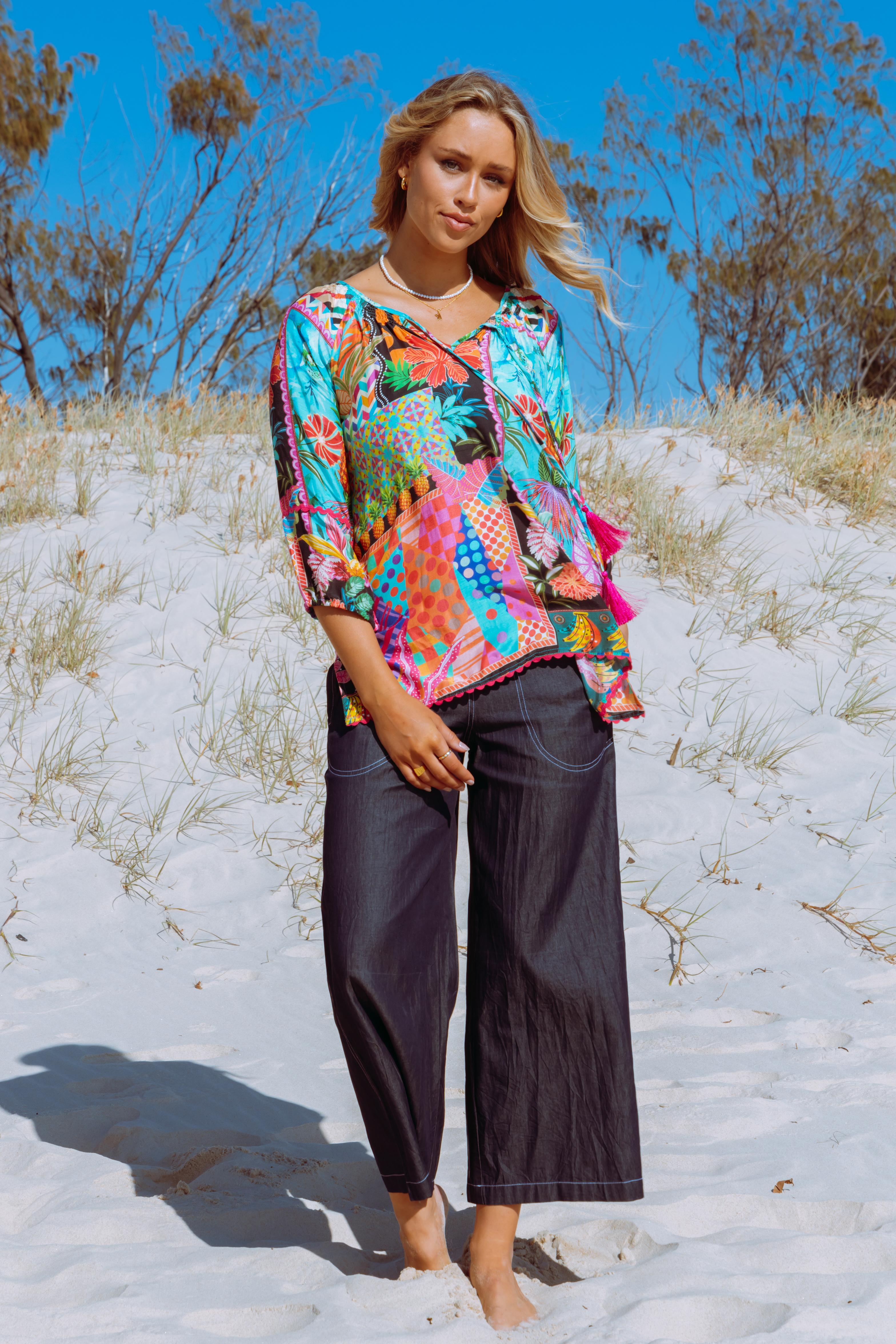 Float through the day in this beautifully crafted LulaSoul Rosella Top Featuring a flattering relaxed fit and Vneck, the top is buttoned through to the hem and boasts wide raglan sleeves that finish just below the elbow. Delicate ladder lace trims and a ruffled sleeve hem add feminine charm, while a curved hem completes the look