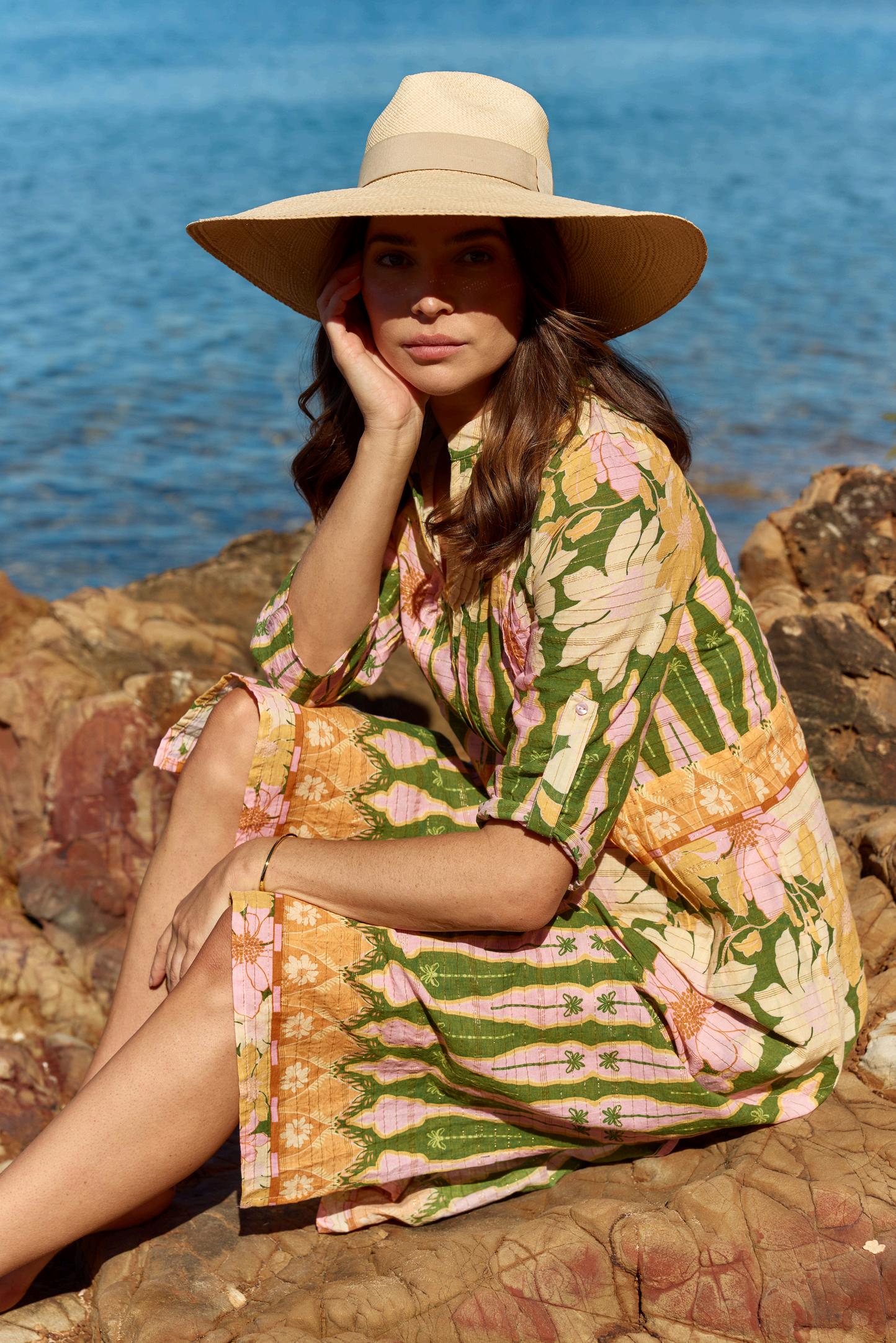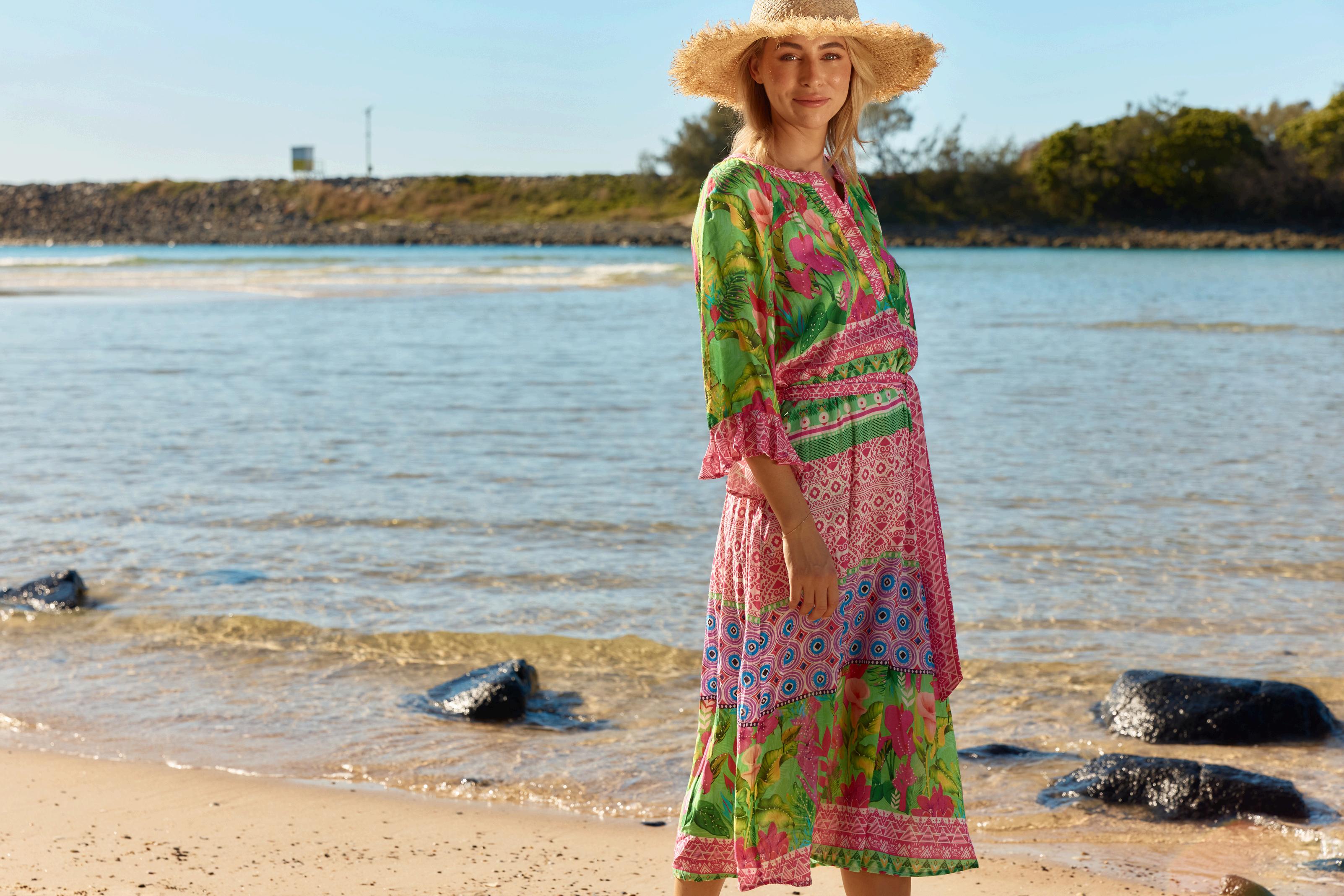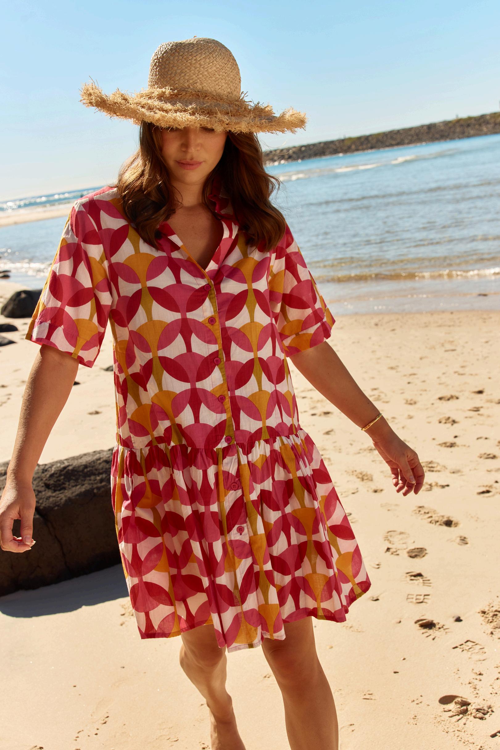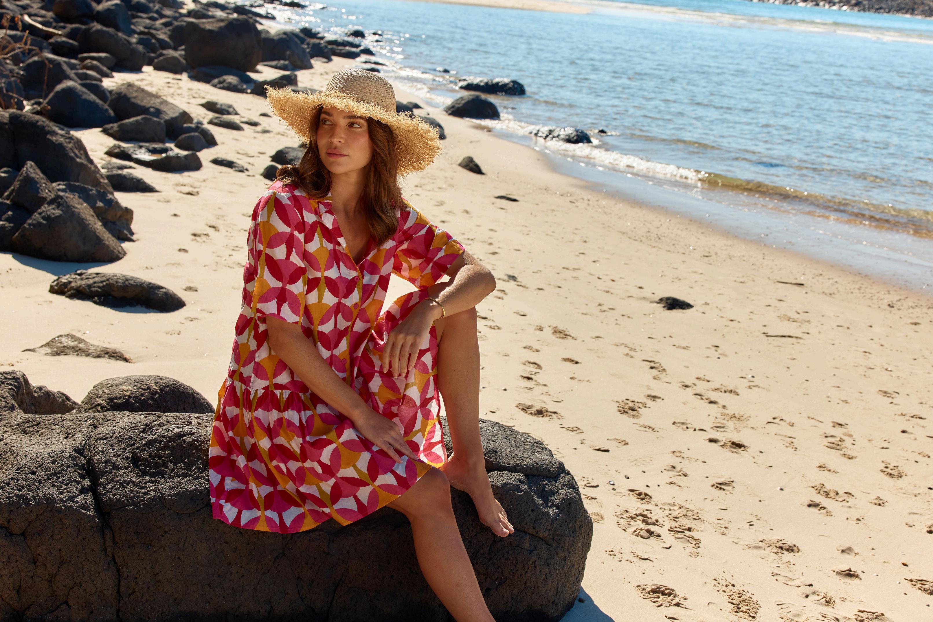 The Phoenix Button Dress is a vibrant homage to 70s Palm Springs Resort wear, capturing the era ’ s blend of bold colors, shapes and effortless glamour. The buttondown front, paired with its flowing silhouette, evokes a sense of laidback sophistication while offering an easy transition from daytime relaxation to evening cocktails. Making it quintessential piece for anyone channeling retro chic with a modern twist.