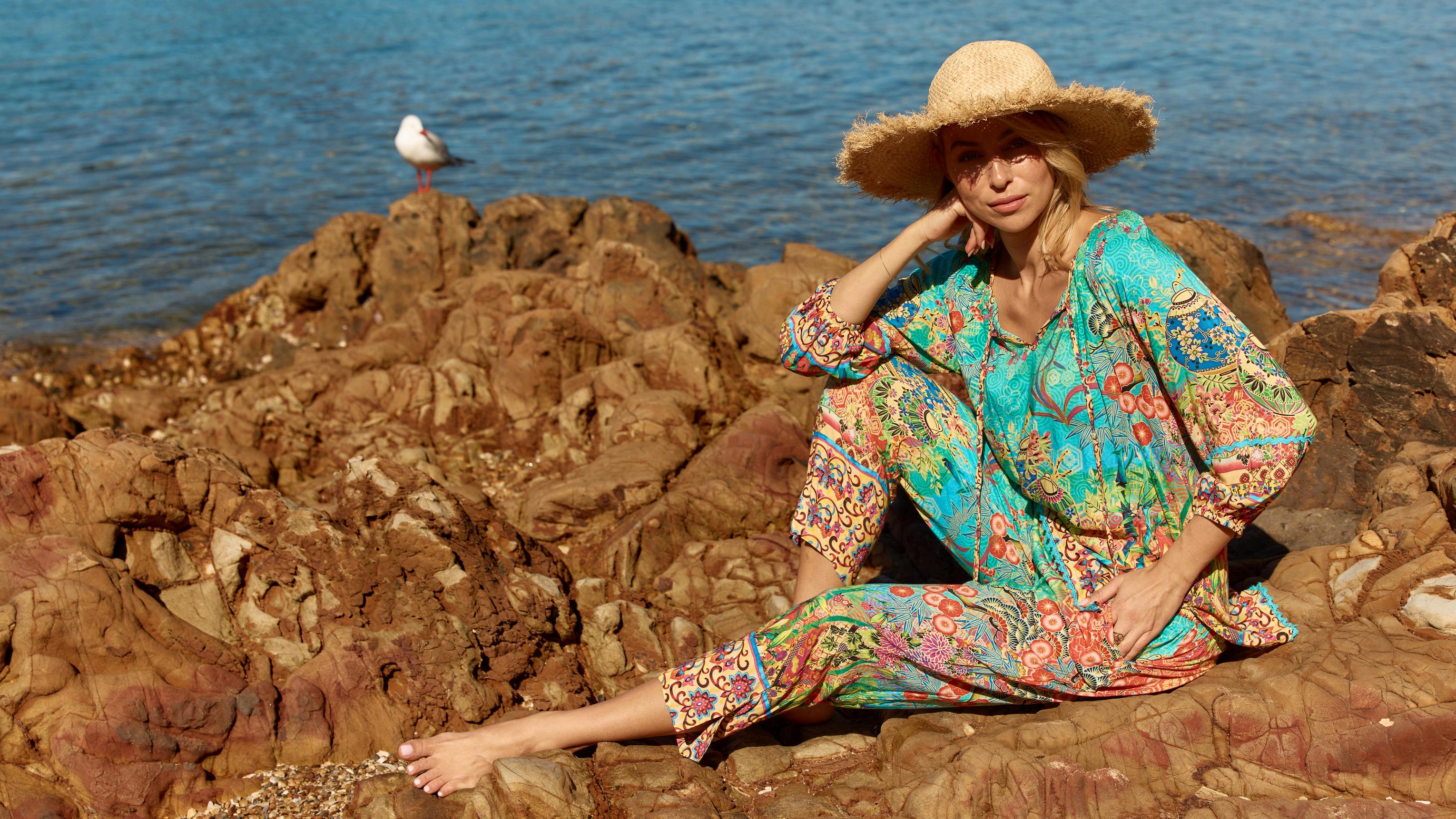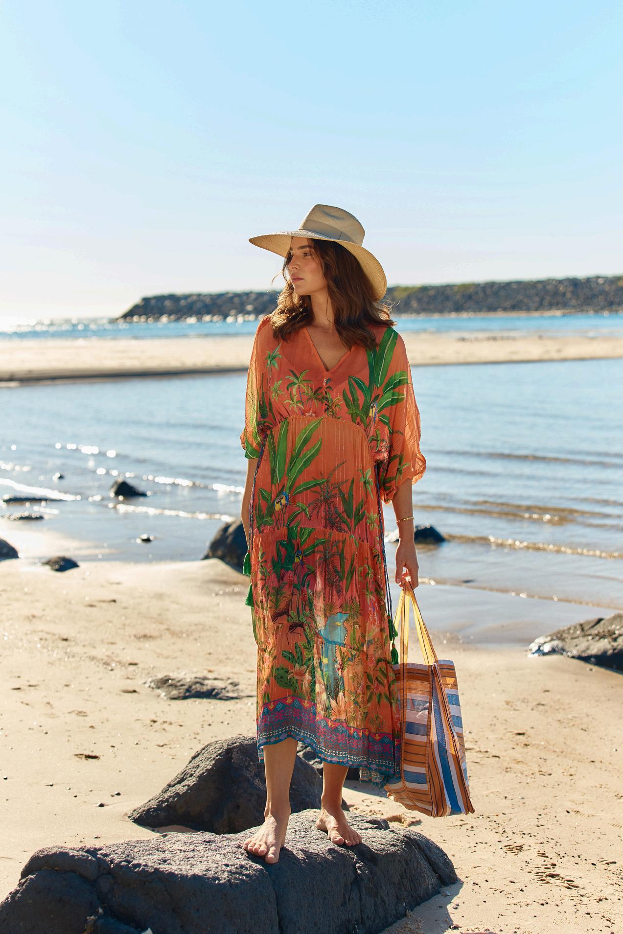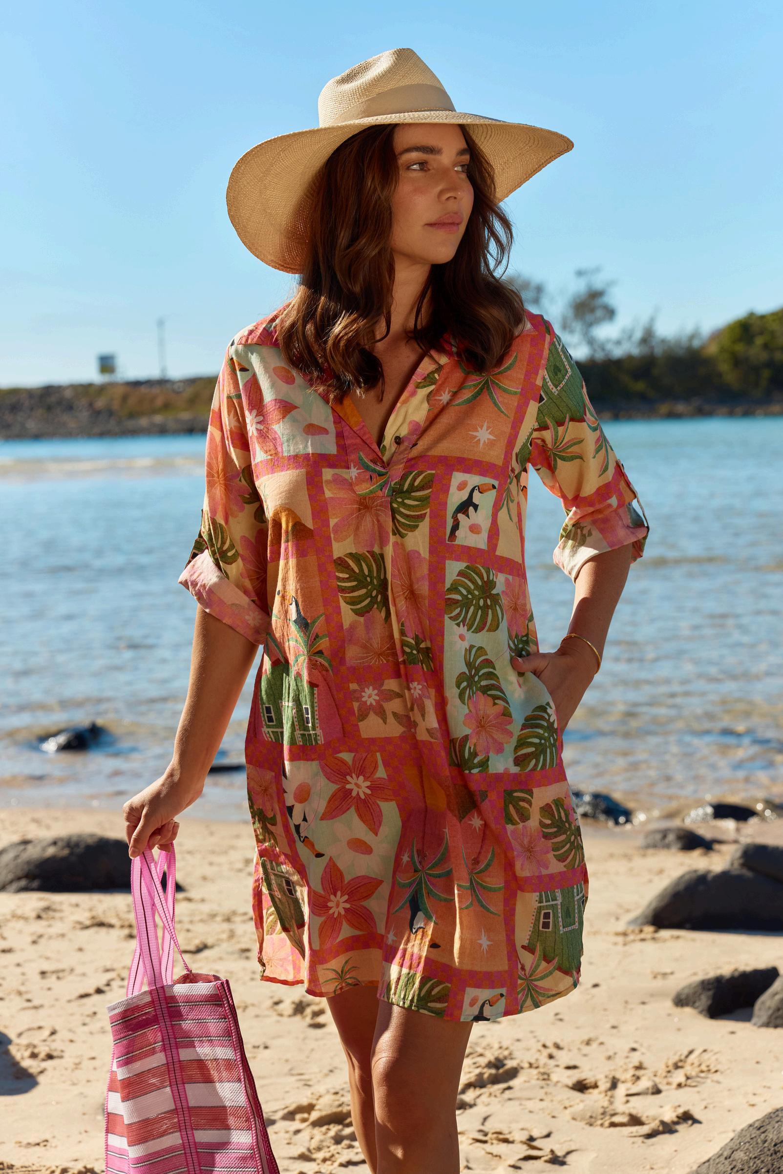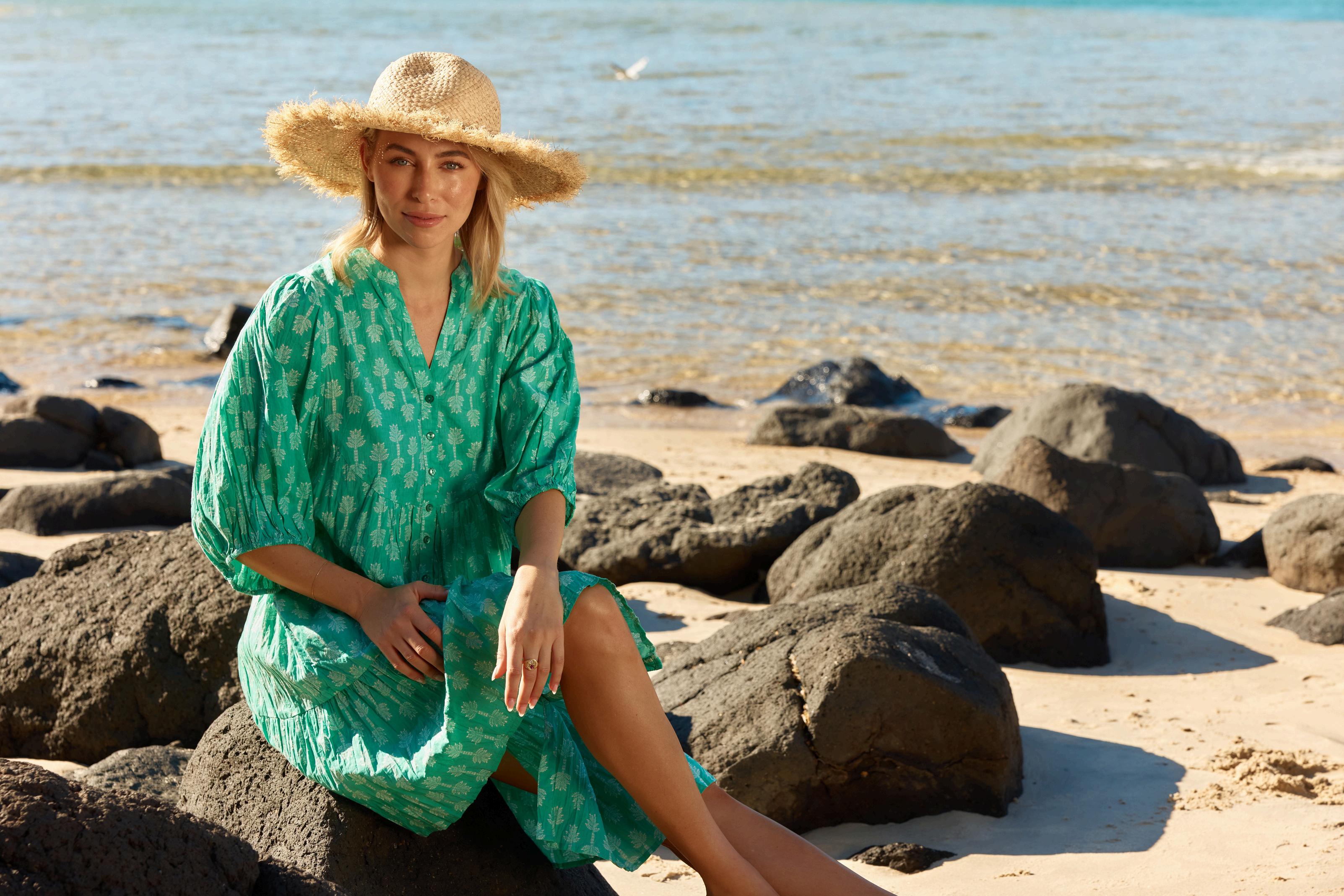 The Phoenix Button Dress is a vibrant homage to 70s Palm Springs Resort wear, capturing the era ’ s blend of bold colors, shapes and effortless glamour. The buttondown front, paired with its flowing silhouette, evokes a sense of laidback sophistication while offering an easy transition from daytime relaxation to evening cocktails. Making it quintessential piece for anyone channeling retro chic with a modern twist.