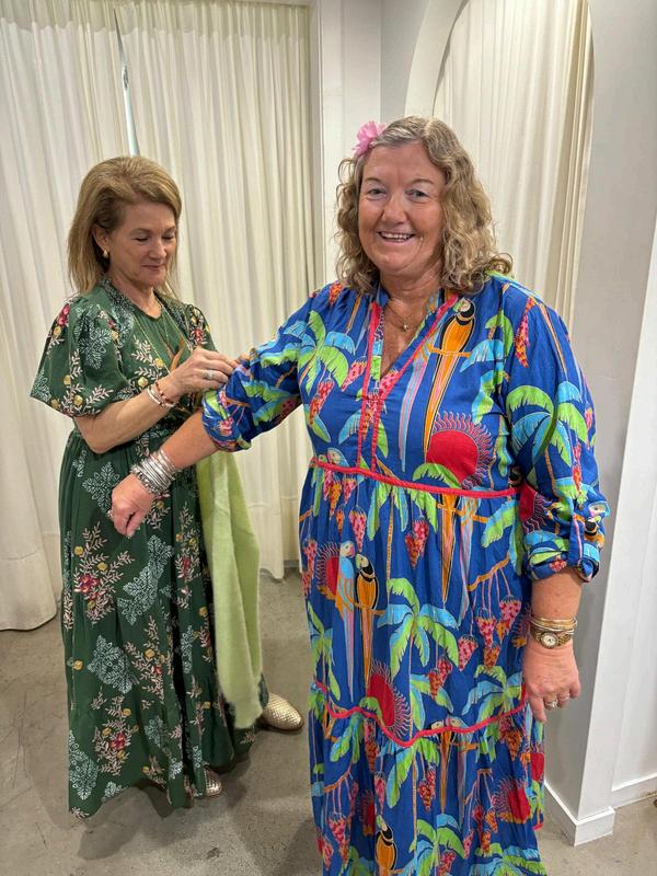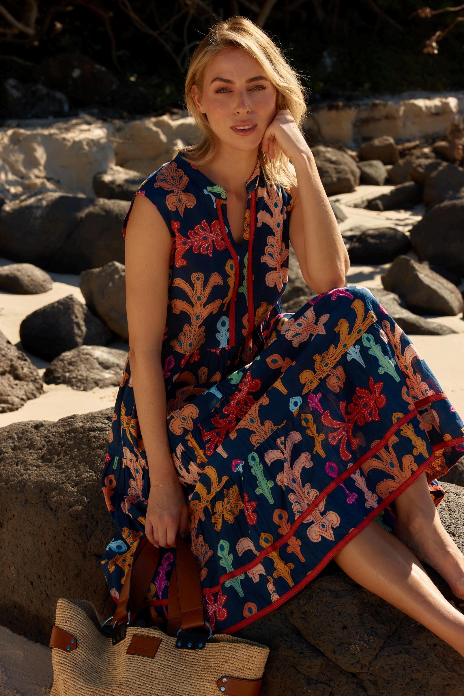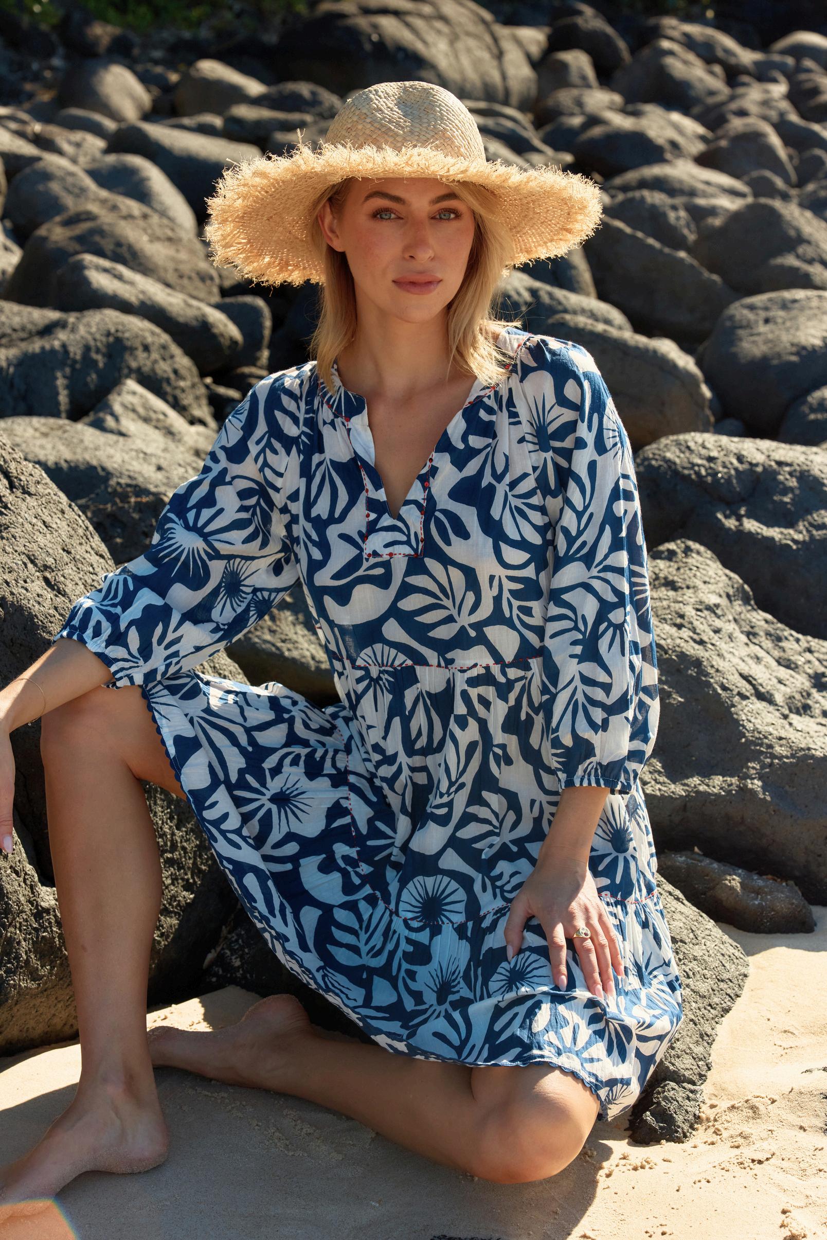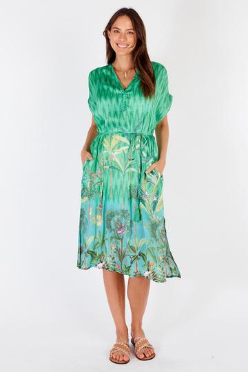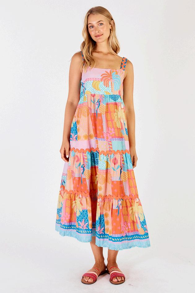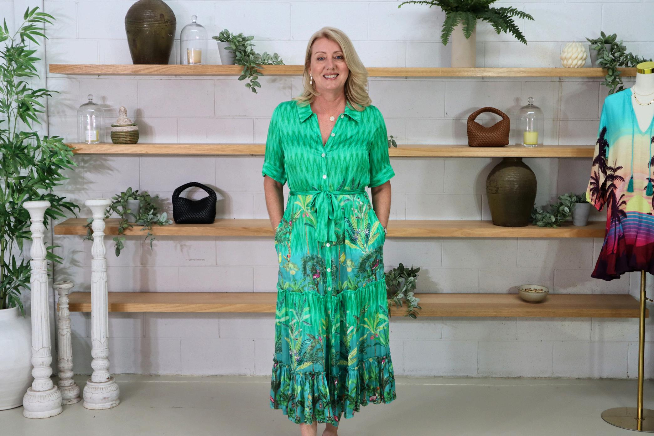 The Phoenix Button Dress is a vibrant homage to 70s Palm Springs Resort wear, capturing the era ’ s blend of bold colors, shapes and effortless glamour. The buttondown front, paired with its flowing silhouette, evokes a sense of laidback sophistication while offering an easy transition from daytime relaxation to evening cocktails. Making it quintessential piece for anyone channeling retro chic with a modern twist.