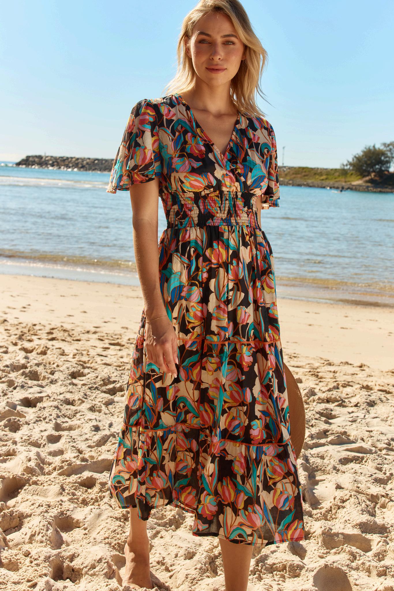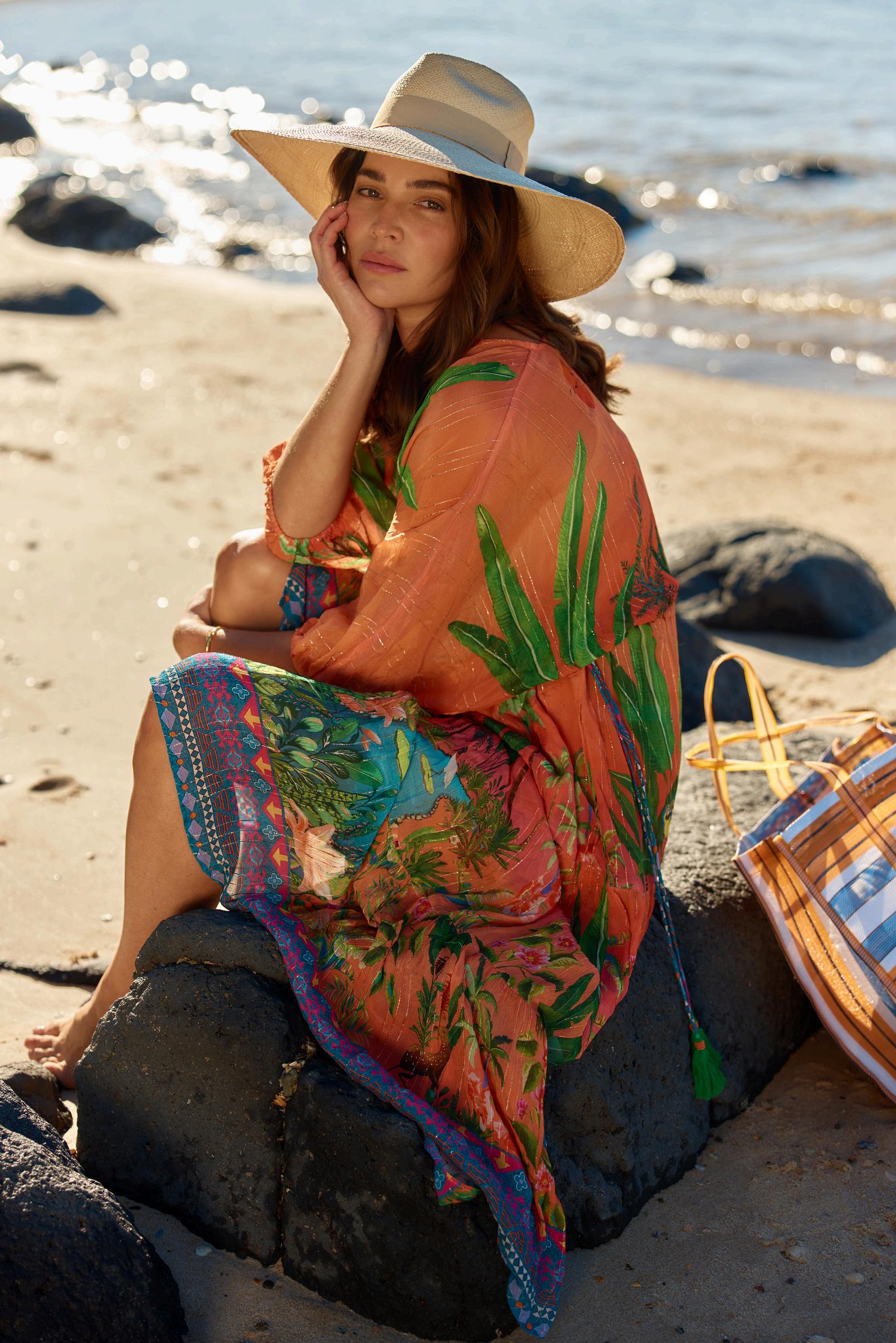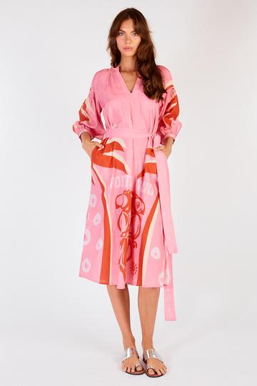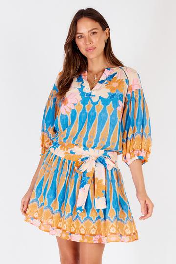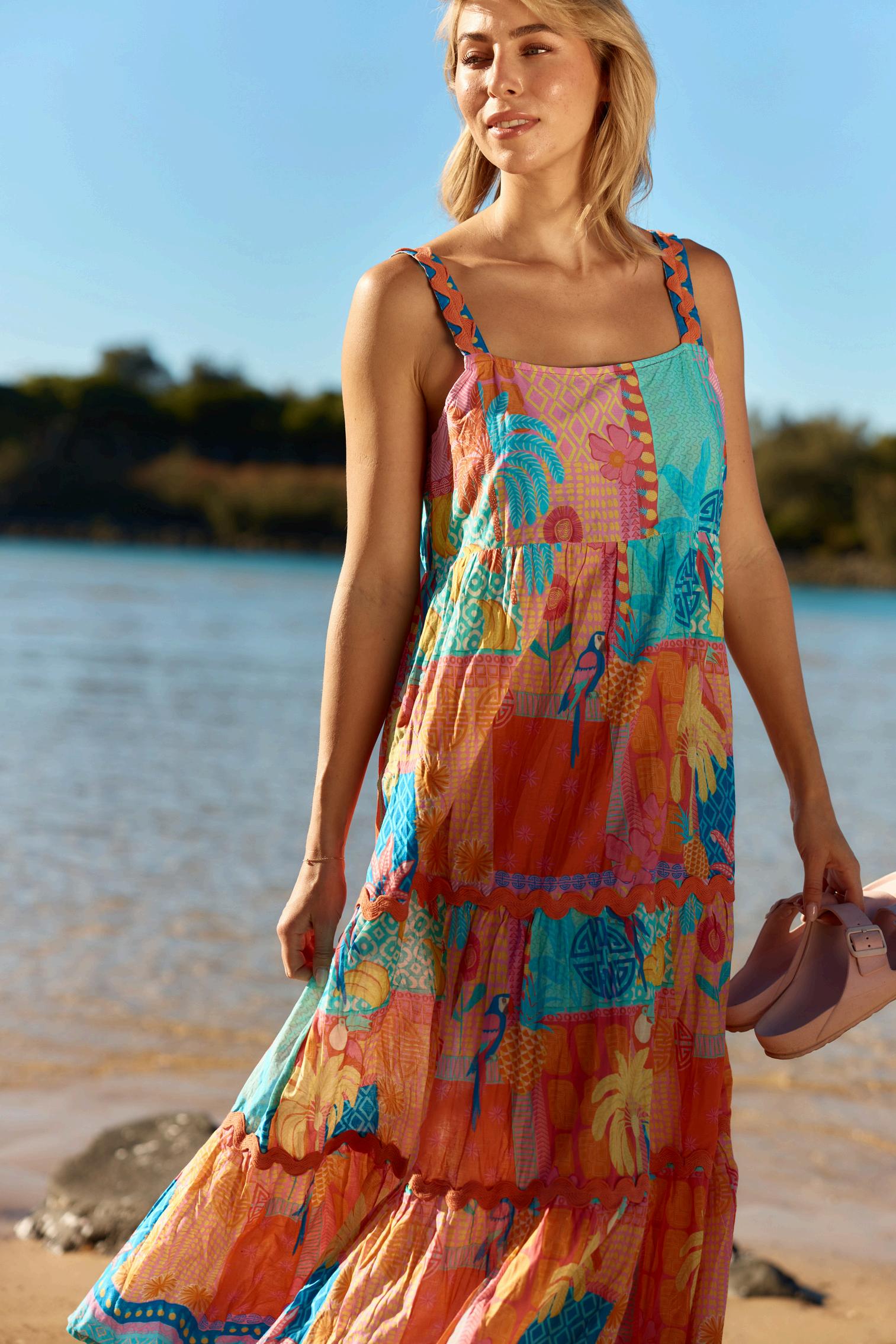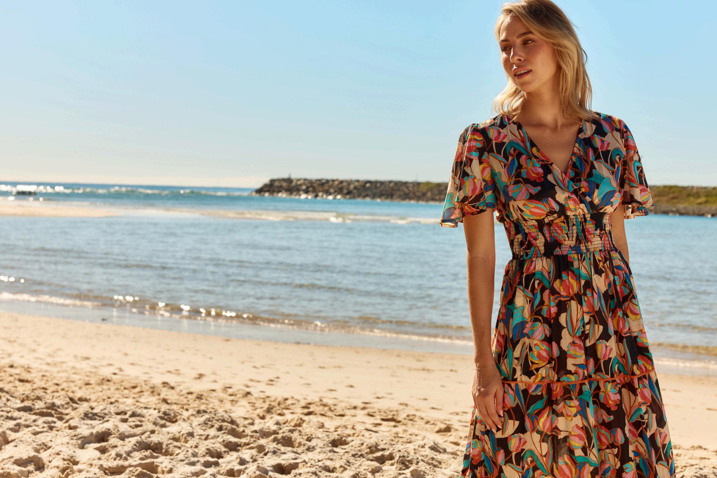 The Phoenix Button Dress is a vibrant homage to 70s Palm Springs Resort wear, capturing the era ’ s blend of bold colors, shapes and effortless glamour. The buttondown front, paired with its flowing silhouette, evokes a sense of laidback sophistication while offering an easy transition from daytime relaxation to evening cocktails. Making it quintessential piece for anyone channeling retro chic with a modern twist.