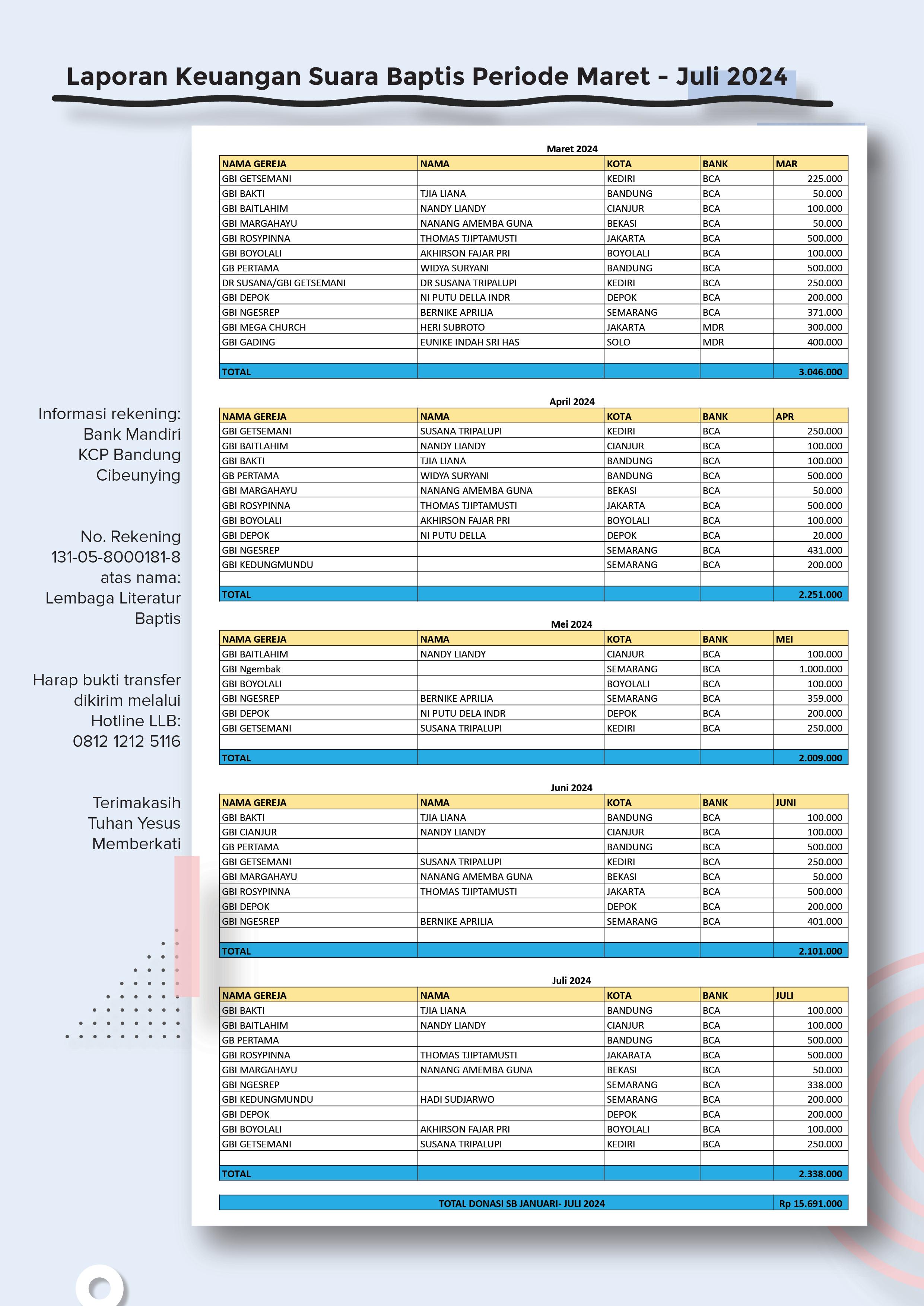 Bank Mandiri KCP Bandung Cibeunying No. Rekening 131-05-8000181-8 atas nama Lembaga Literatur Baptis atau melalui Giro Pos No. 4000 004 235 atas nama Lembaga Literatur Baptis