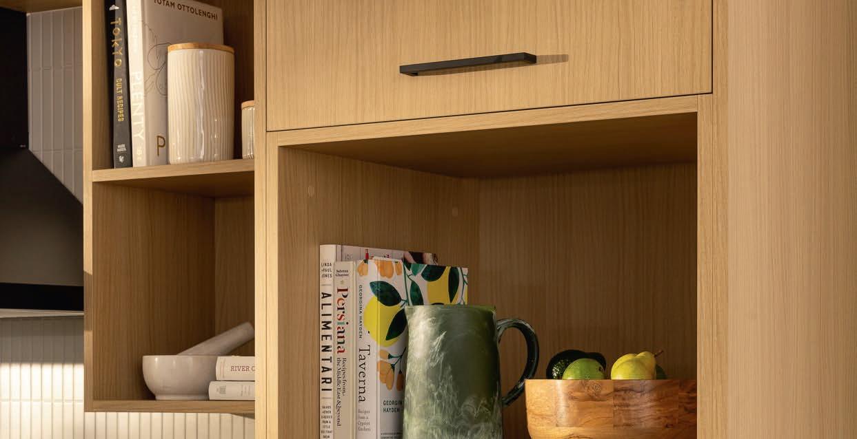 Embrace your kitchen’s storage possibilities with our expanded range of customisable open shelves. Incorporate these functional and stylish in-built shelves into your kaboodle kitchen design, to create feature storage that adds practicality and personality.